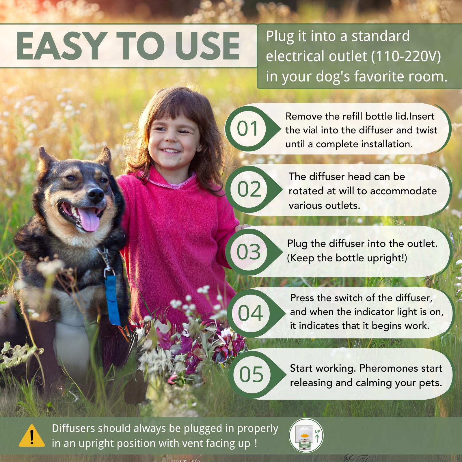 【Safe, Non-Toxic & Odorless】 Formulated with non-toxic, inedible ingredients, this dog diffuser is safe to use around all breeds. It’s scentless, mess-free, and a perfect choice for pet parents seeking an easy calming solution without side effects