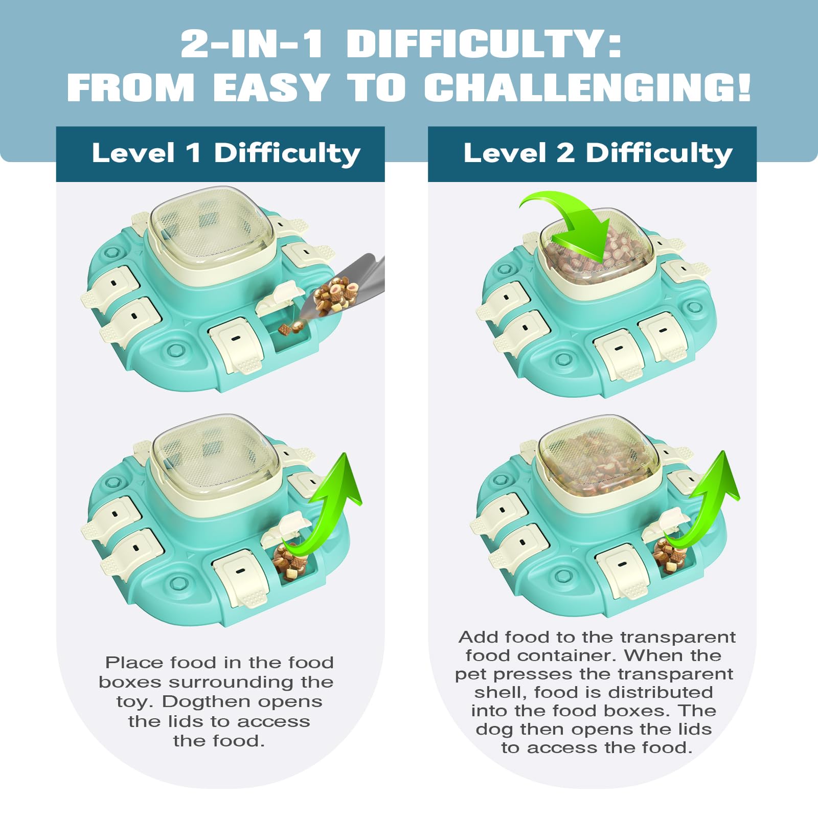 2 levels in 1 interactive dog toy: get your puppy started with a Level 1 puzzle and add some treats in the surrounding cubicle where the dog can get a tasty reward by nudging the lid. For level 2, just put some food in the top compartment, teach your dog to press the top lid, distribute the food to the bottom compartment, and enjoy their food at the end