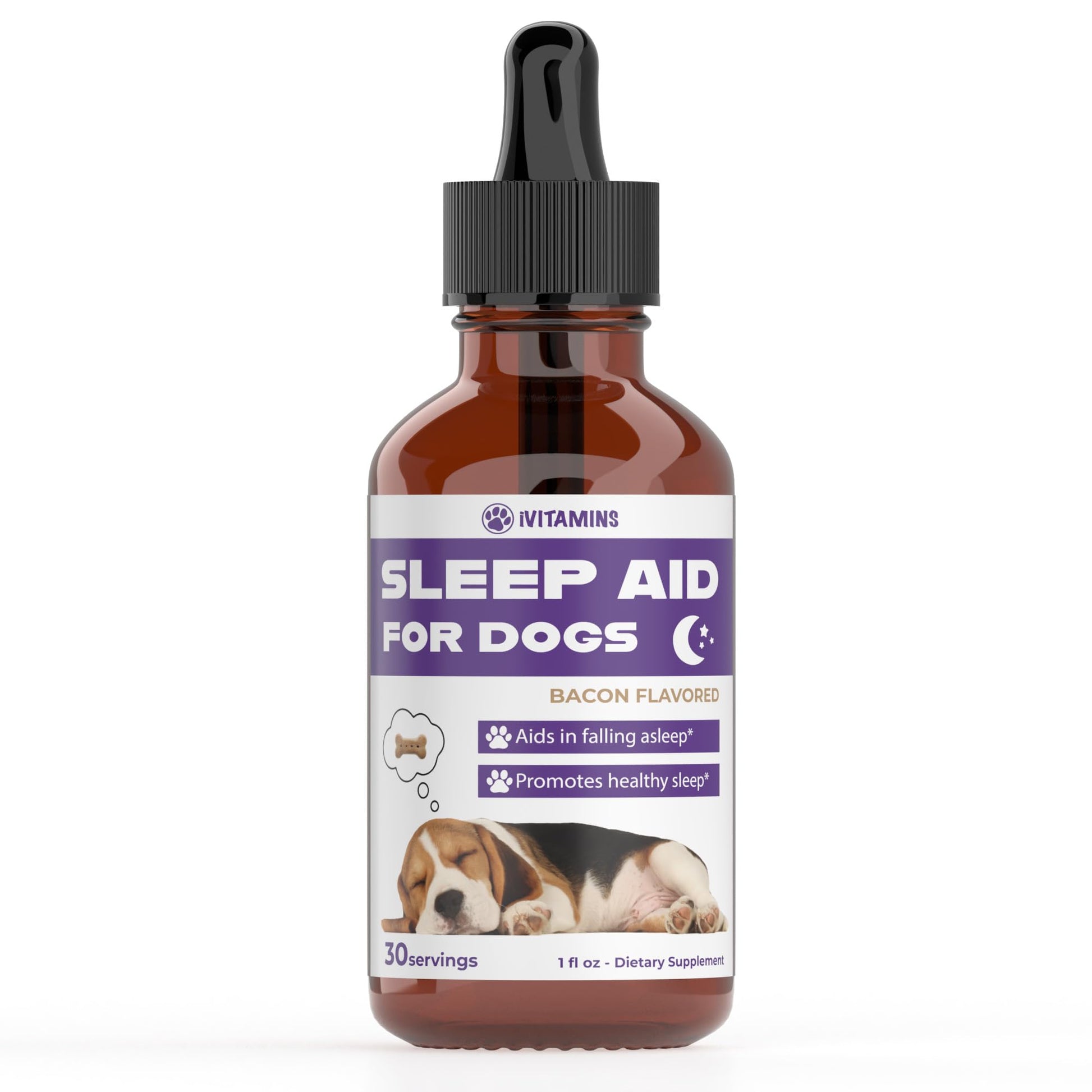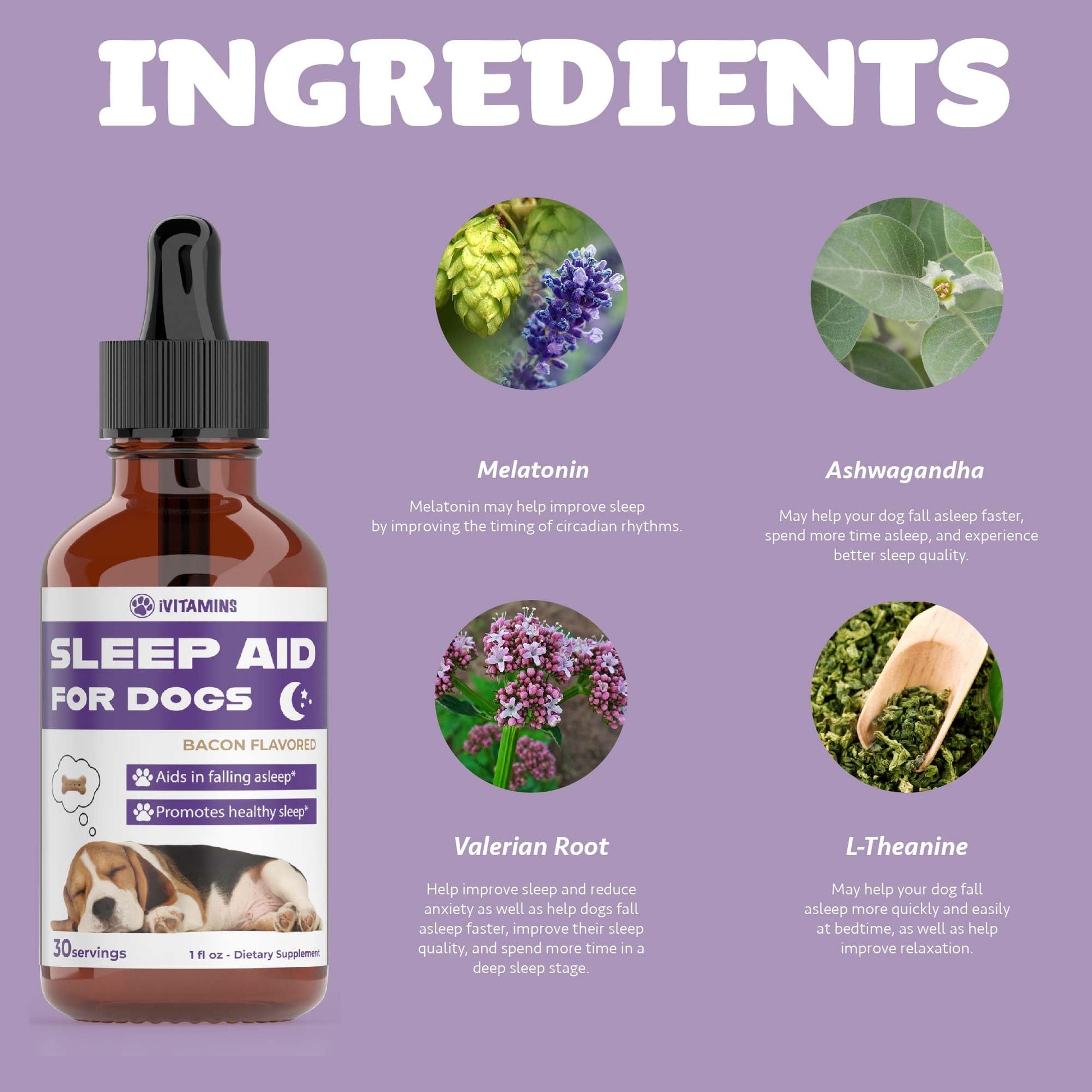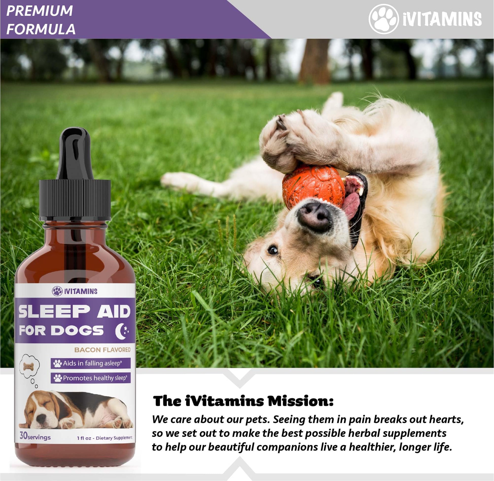 Details: iVitamins sleep aid for dogs is specially formulated to help provide a comprehensive sleep aid support: calming at night, aiding in falling asleep faster and promoting restful sleep without interruptions. We put together a liquid formulation for your pup, which provides better absorption than chews, pills, capsules or tablets. Our dog sleeping aid provides complete support for all key causes of insomnia in healthy dogs, including: anxiety, stress, agitation, difficulty falling asleep, and overall restlessness.