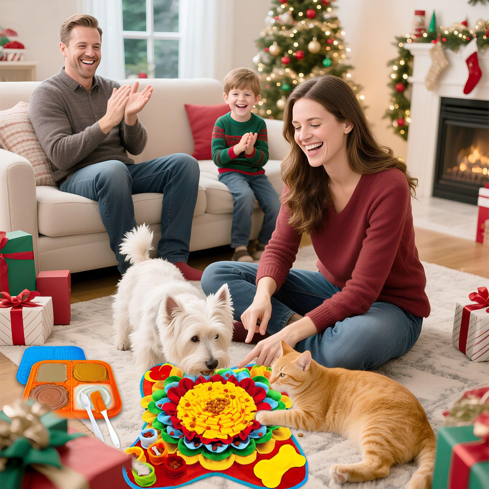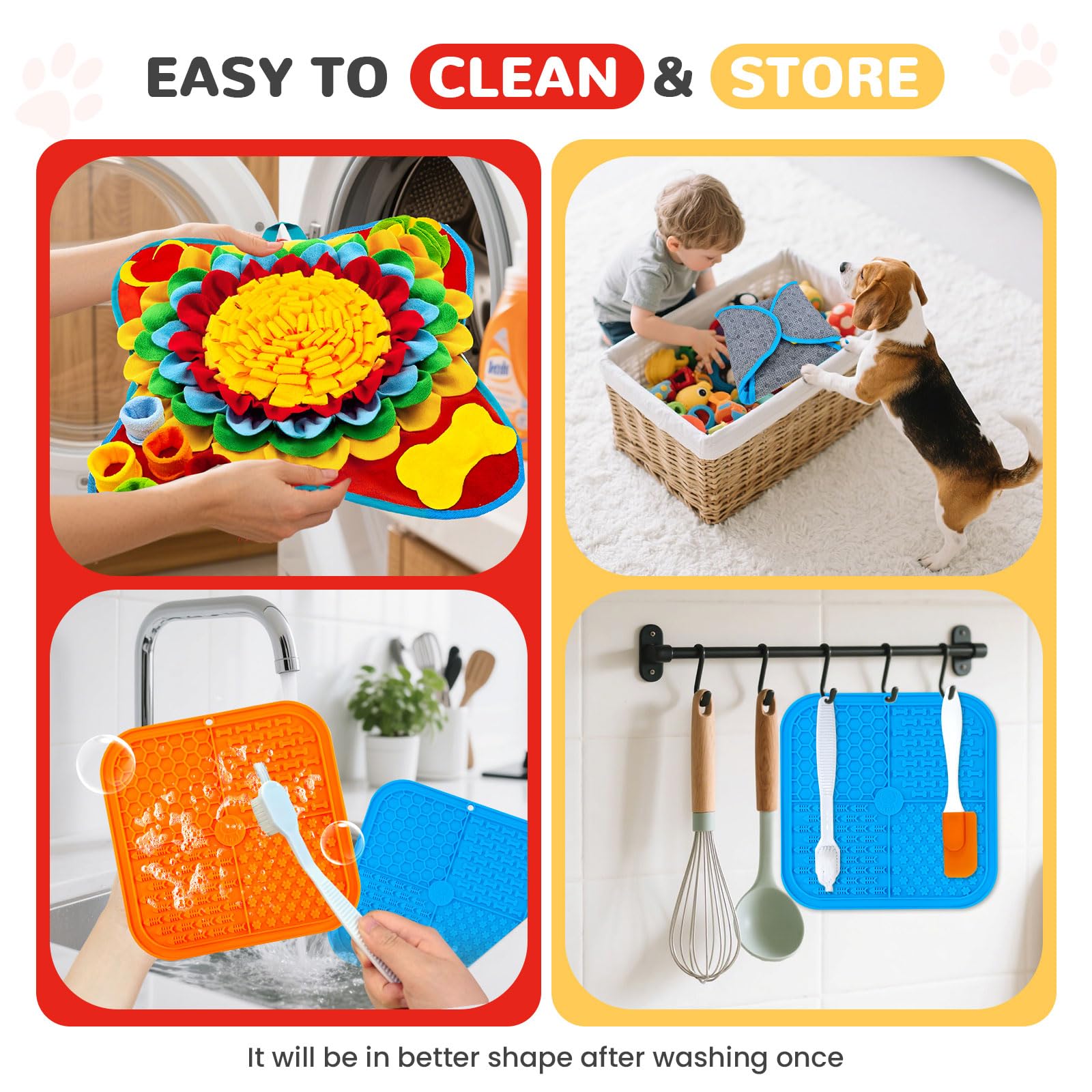 • Cognitive Boost & Anxiety Relief: Our dog puzzle toys stimulate mental and stabilize mood. Pet snuffle mat conceals treats during alone time, engaging dogs in scent-tracking that stimulate their brain, effectively combat boredom and separation anxiety. Dog lick mat promotes mindful focus through deliberate, slow licking during stressful situations like grooming or bath time. This double-duty approach builds stress resilience and fosters cognition through enrichment games and focused feeding