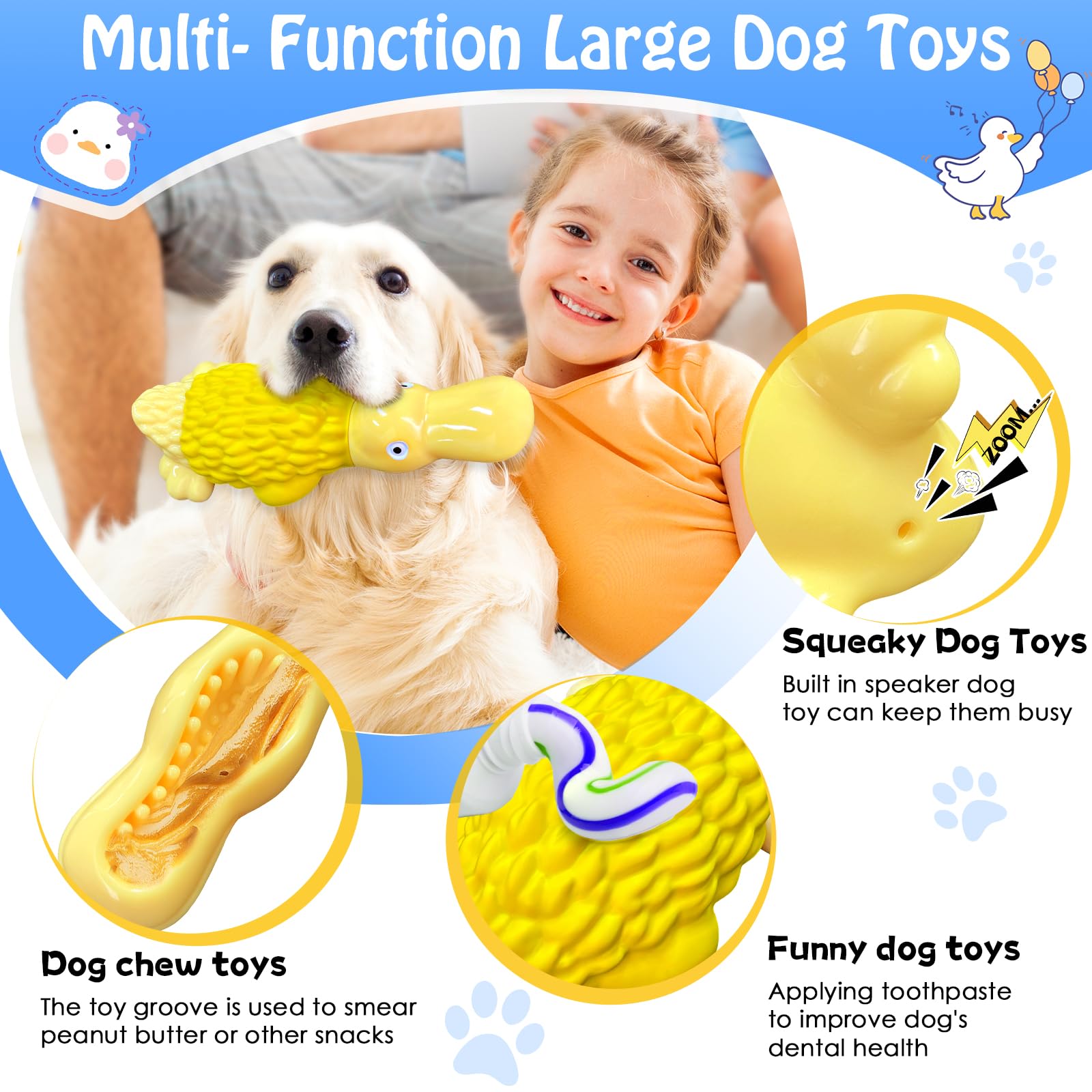 - 【Duck Dog Toys & Dental Care】The cute duck-shape large dog toys will attract your pet's interest, while the intricate textured surface works like a toothbrush; When your pet chews this interactive dog toys for boredom, the textured surface rubs against their tooth, helping to wipe off stains and reduce tartar; Besides, you can apply a thin layer of toothpaste or peanut butter on the grooves of the dog chew toys, improving dental health while interacting with or training your pet
