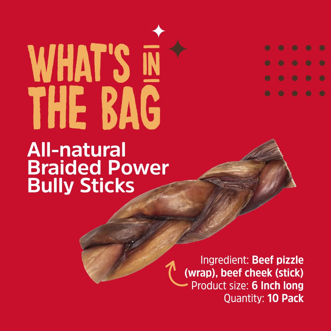 Dogfy Braided Power Bully Sticks Dog Chews (6”, 10-Pack), 2-in-1 Power Chews: Premium Beef Cheek Wrapped in Beef Pizzle, Braided Together for a Very Long Lasting Chew, Great for Medium Dogs
