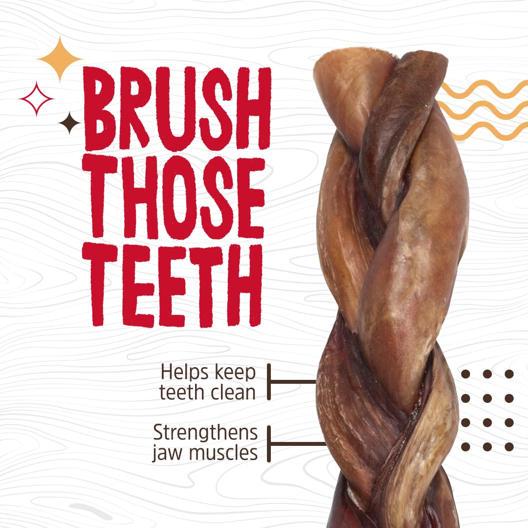 MORE CHEWING TIME: These delicious chews last longer and are thicker than standard bully sticks and even braided bully sticks. They are great for when you need to keep your dog stimulated, calm, and focused for an extended period of time. In addition, they help to support dental health by reducing tartar & plaque buildup, leaving dogs with cleaner teeth and fresh breath.