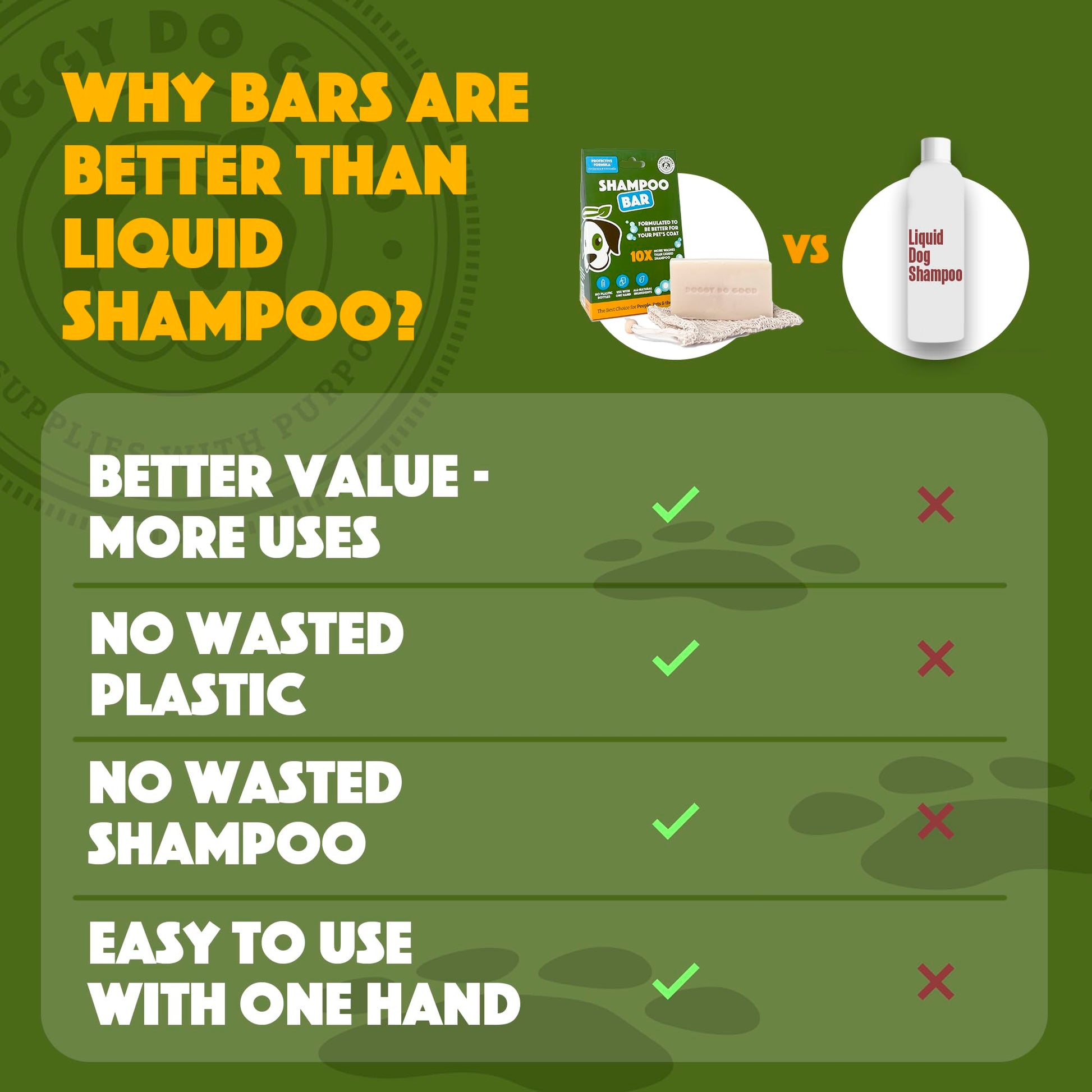 - The best choice for people, pets, and the planet: By choosing Doggy Do Good Shampoo Bar, you are making a responsible choice for your pet's well-being and the environment. Our natural formula is safe for you, your dog and the planet.