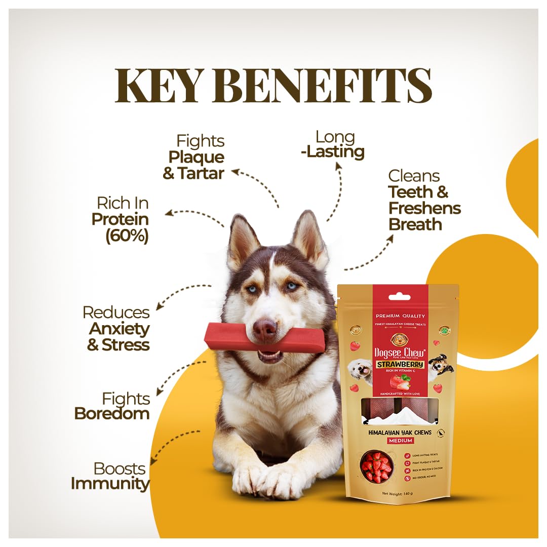 - SKIN & COAT HEALTH: Strawberries in Dogsee yak cheese dental chews are a great source of vitamins C and A, contributing to your dog's nutritional intake and skin health.