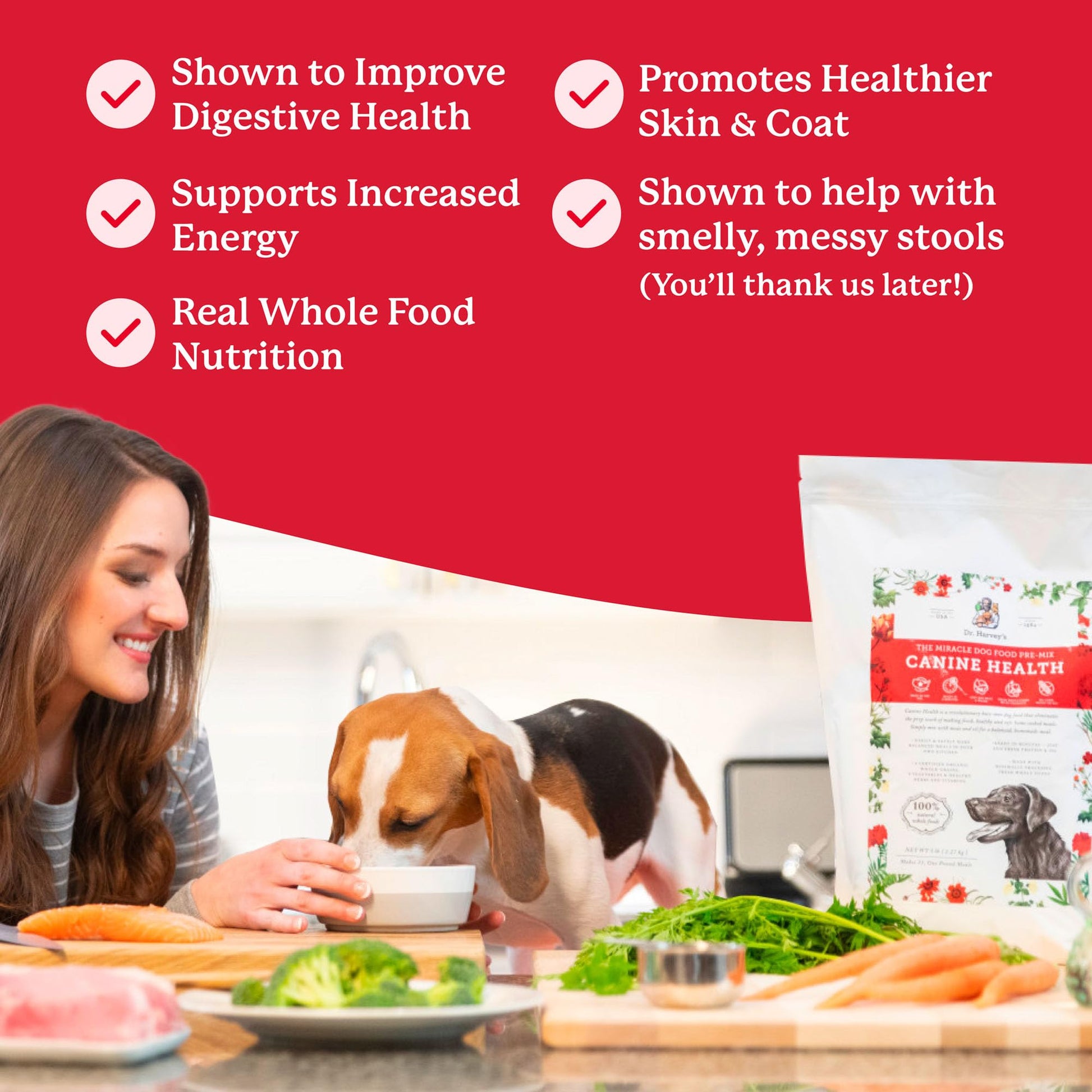 - Nutrition You Can See and Smell! Canine Health is a base mix used to effortlessly create balanced, homemade meals for your dog as a whole food alternative to kibble. Feeding your dog a whole food, nutrient dense diet has been shown to improve digestion, increase energy, help improve itchy skin, and produce firmer, less smelly stools. (You'll thank us later!)