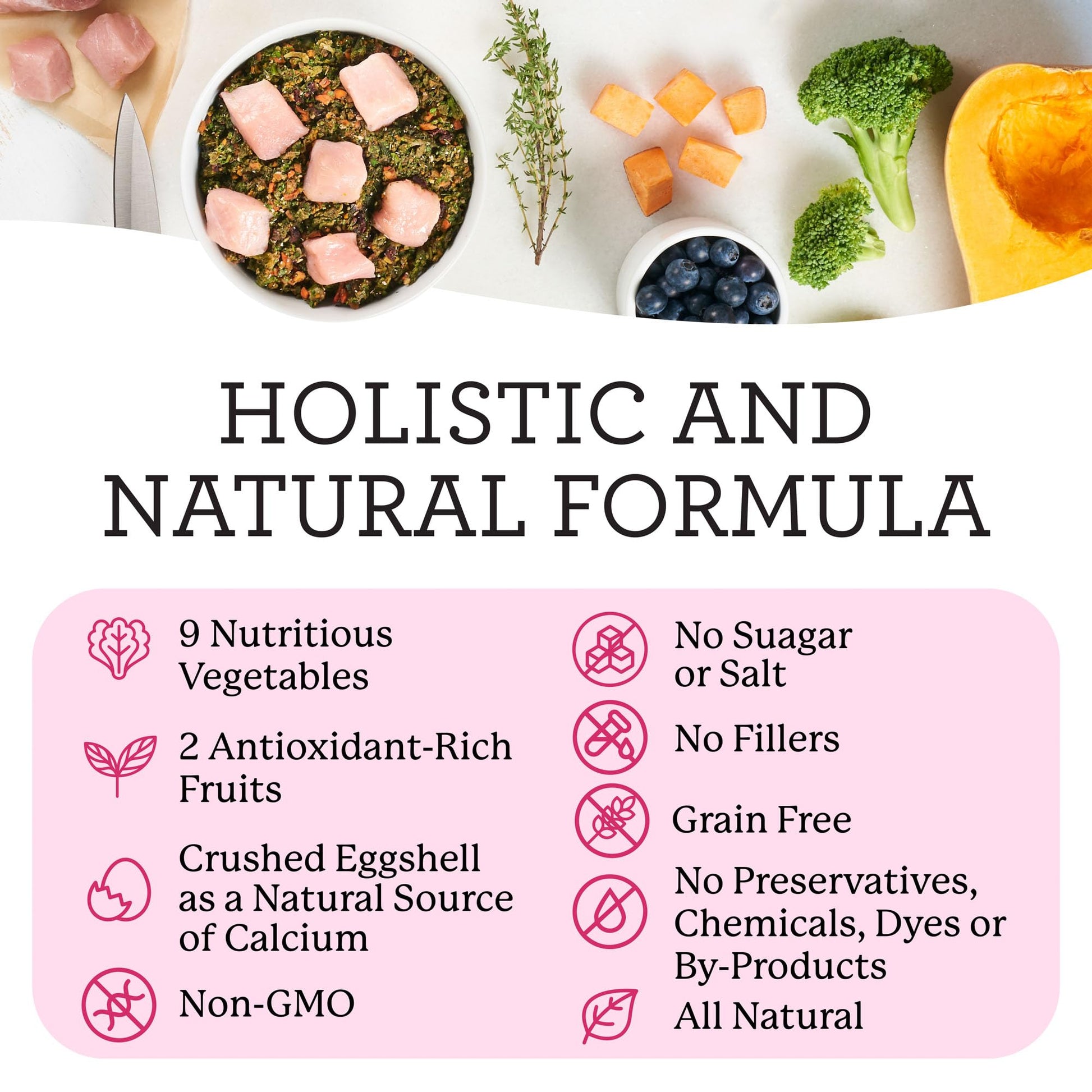 - This 6 pound bag of dehydrated whole superfoods makes 56, one pound meals when combined with a protein of your choice. Guaranteed Analysis: Crude Protein (min) - 11%, Crude Fat (min) - 2%, Crude Fiber (max) - 8%, Calorie Content (Calculated) - 2641 kcal ME/kg; 71 kcal ME/scoop