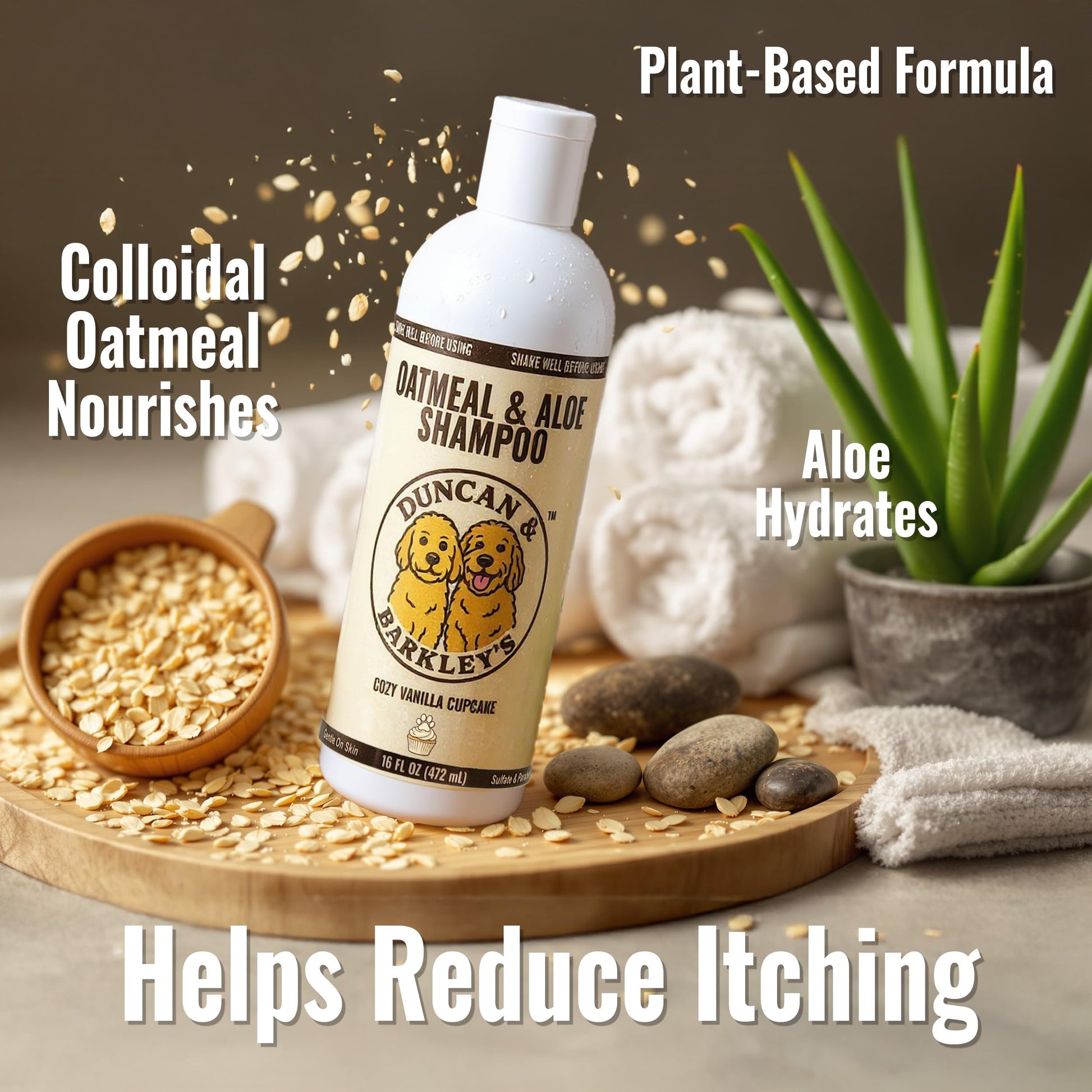 Duncan & Barkley’s Oatmeal & Aloe Dog Shampoo and Conditioner 16 Oz Bottles - Cozy Vanilla Cupcake Scent, Gentle Pet Wash for Sensitive Skin and Vital Volumes Tips Card - Bundle