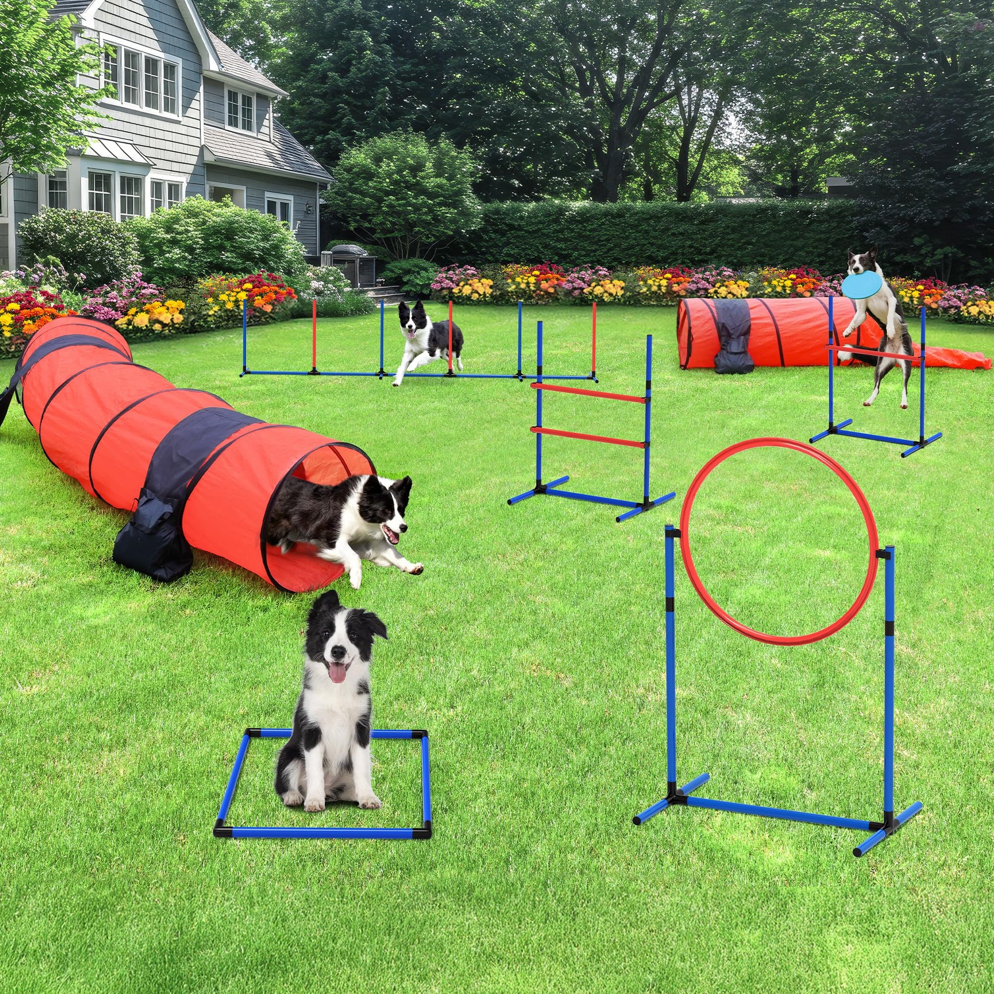 Versatile Dog Agility Training Kit - Transform your backyard into a professional-grade agility course with this all-inclusive set. Adjustable hurdles and rings allow customized height settings from beginner to advanced levels, while the extended foldable tunnel withstands rigorous training sessions. Includes 3 durable flying discs, 1 square pause box, 1 ergonomic teaser stick, and 1 training whistle to create endless obstacle combinations. Ideal for burning off energy, improving coordination, and strengthening the bond between you and your furry athlete