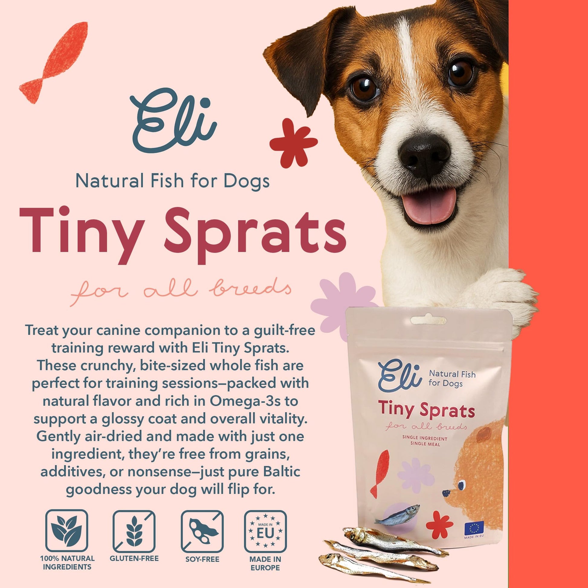Eli Tiny Sprats – Natural Dog Treats, Whole Small Fish, High in Protein and Omega-3, Grain Free, Single Ingredient, No Additives, Gluten Free, Air Dried, Training Snack or Meal Topper – 2 Pack