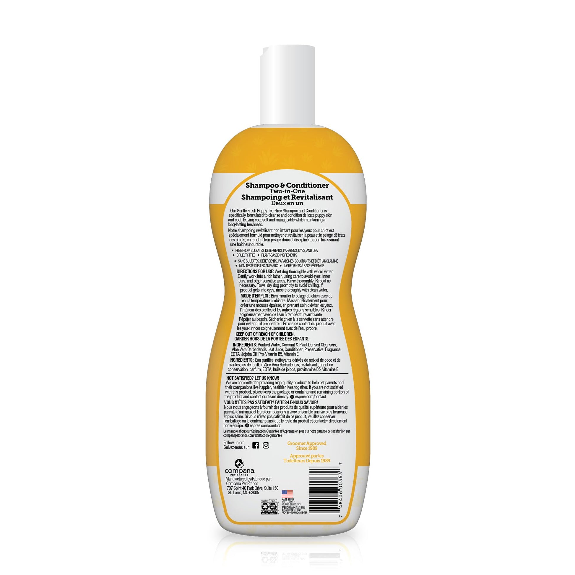 Details: Introducing our Espree Gentle Fresh Puppy Shampoo & Conditioner, designed with your puppy’s comfort and safety in mind. This tearless formula ensures a stress-free bathing experience, as it is gentle on your dog’s eyes and skin. The key ingredient, Aloe Vera, is used for its soothing and hydrating properties, which helps maintain your puppy’s natural moisture while keeping their coat soft and shiny. Unlike other products on the market, this dog shampoo and conditioner is completely free of harsh chemicals such as sulfates, parabens, and artificial dyes, making it ideal for puppies with sensitive skin. Our 2-in-1 formula simplifies the grooming process by combining shampoo and conditioner in one easy step. It cleanses, conditions, and leaves your puppy’s coat soft, fluffy, and smelling fresh. With no harsh additives, it’s safe for regular use and will not strip your dog’s skin of its natural oils. Espree has been trusted and approved by groomers since 1989, so trust that we will keep your dogs clean.