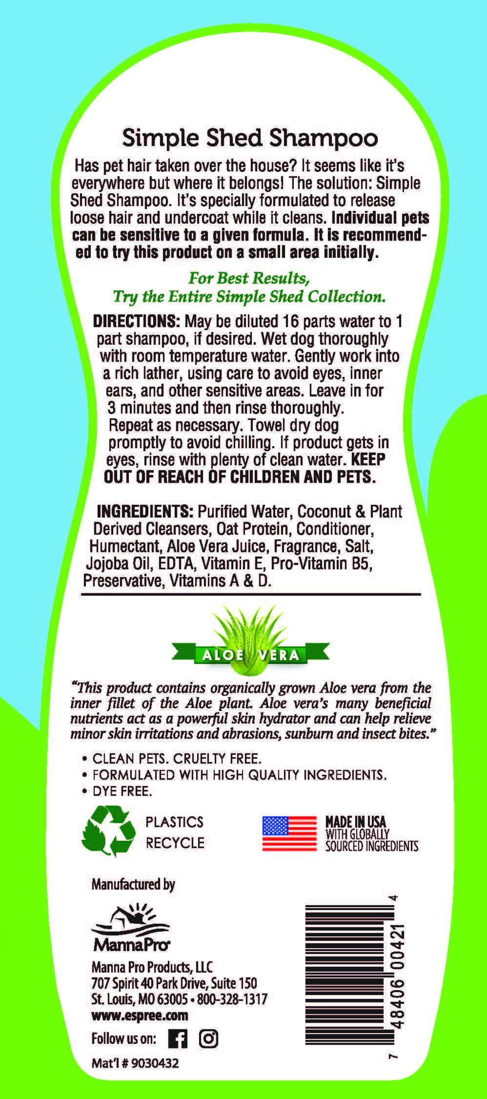 Details: Espree’s Simple Shed Shampoo is formulated to release loose hair and undercoat while removing dirt and oils. Natural and organic Oat Proteins and Aloe Vera strengthen the hair shafts of viable strands to create the best coat condition possible. Frequent use will reduce seasonal and non-seasonal shedding. For Best Results use with Espree Simple Shed Treatment.