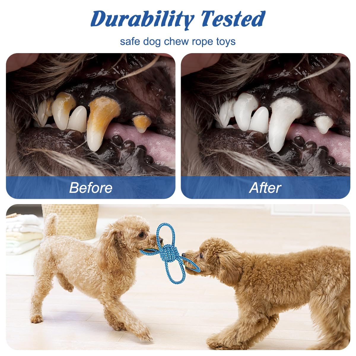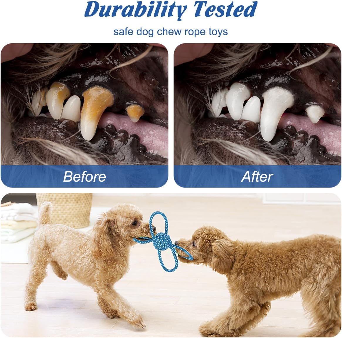 • ✔High-quality Material for Dog's teeth and health: Non-toxic and tasteless natural cotton rope toys can safely protect and clean the teeth of dogs. The cotton rope knot is a wear-resistant, tightly woven twist. And sturdy knots make puppy teething toy stand up for aggressive chewing. It won’t hurt the dog’s teeth or gums.
