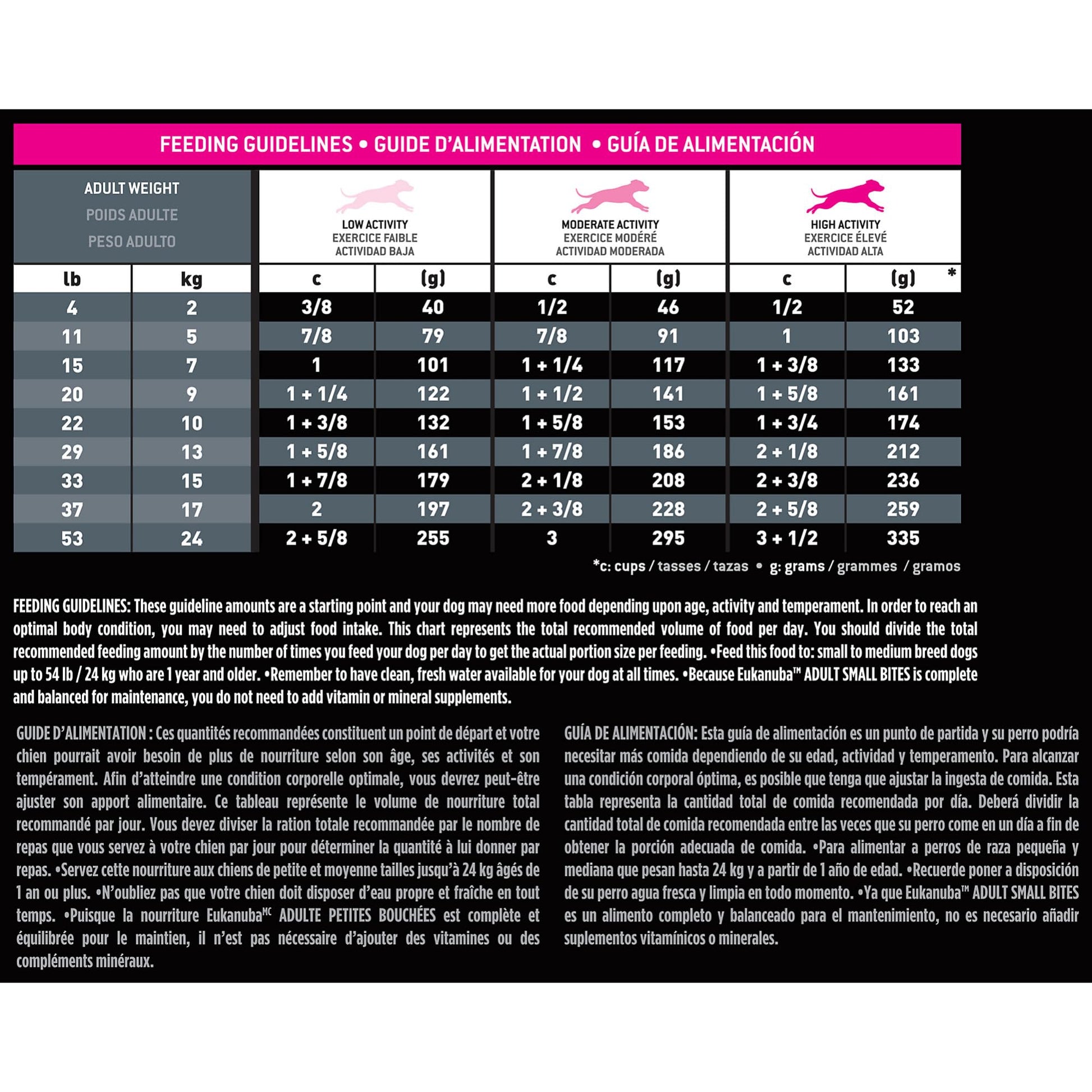 Details: Your small or medium breed dog is anything but ordinary. They require extraordinary nutrition to perform their best. Feed your companion Eukanuba Adult Small Bites Dry Dog Food, a diet created specifically for your dog’s body, mind, and energy. Tiny, bite-sized kibble designed for smaller muzzles makes it easy to chew this adult dog food. Animal proteins, glucosamine, and chondroitin sulfate keep muscles lean and joints limber and strong. DHA and vitamin E help support healthy brain function to help your dog stay sharp. Optimal levels of fats and carbohydrates help fuel an active lifestyle. 3D DentaDefense reduces tartar buildup for clean teeth and healthy gums. A natural fiber and prebiotic blend aids gentle digestion to help keep your dog feeling healthy. Plus, high-quality chicken is the first ingredient to power your small dog’s day. Pair this kibble with Eukanuba Adult Wet Dog Food for the perfect complement. Your dog always puts their best paw forward for you. Return the favor by feeding them Eukanuba and fuel the extraordinary in every day, satisfaction guaranteed.