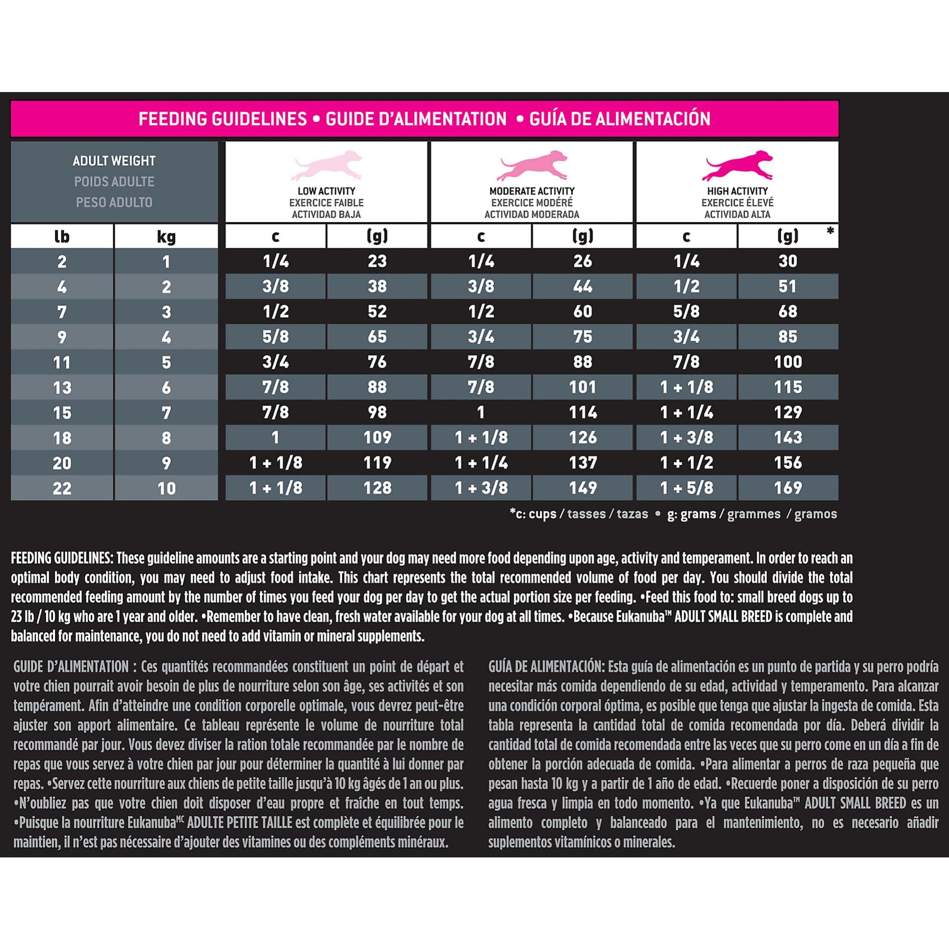 Details: Your small breed dog is anything but ordinary, and they require extraordinary nutrition to perform their best. Fuel your companion’s body, mind, and energy with Eukanuba Adult Small Breed Dry Dog Food. Animal proteins, glucosamine, and chondroitin sulfate help keep muscles lean and joints limber and strong. DHA and vitamin E help support healthy brain function to help your small breed dog stay sharp. This adult dog food is formulated with optimal levels of fats and carbohydrates to help fuel an active lifestyle. 3D DentaDefense supports dog dental care by reducing tartar buildup for clean teeth and healthy gums. A natural fiber and prebiotic blend aids gentle digestion to help keep your small breed dog feeling healthy. Plus, high-quality chicken is the first ingredient in this small breed adult dog food to power your dog’s day. Mix the small dog food kibble with Eukanuba Adult Wet Dog Food for the perfect complement. Your dog always puts their best paw forward for you. Return the favor by feeding them Eukanuba and fuel the extraordinary in every day, satisfaction guaranteed.