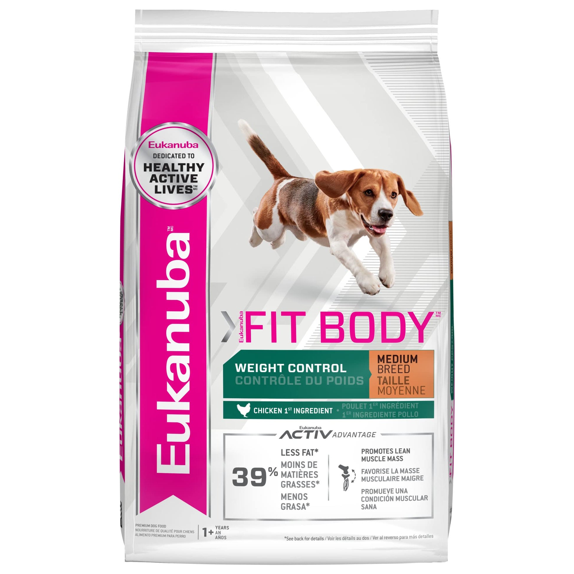- SUPPORTS LEAN BODIES: L-carnitine, 39% less fat (vs. Eukanuba Adult Medium Breed Dry Dog Food), and an adapted blend of carbohydrates help promote a lean, active body and medium dog weight control