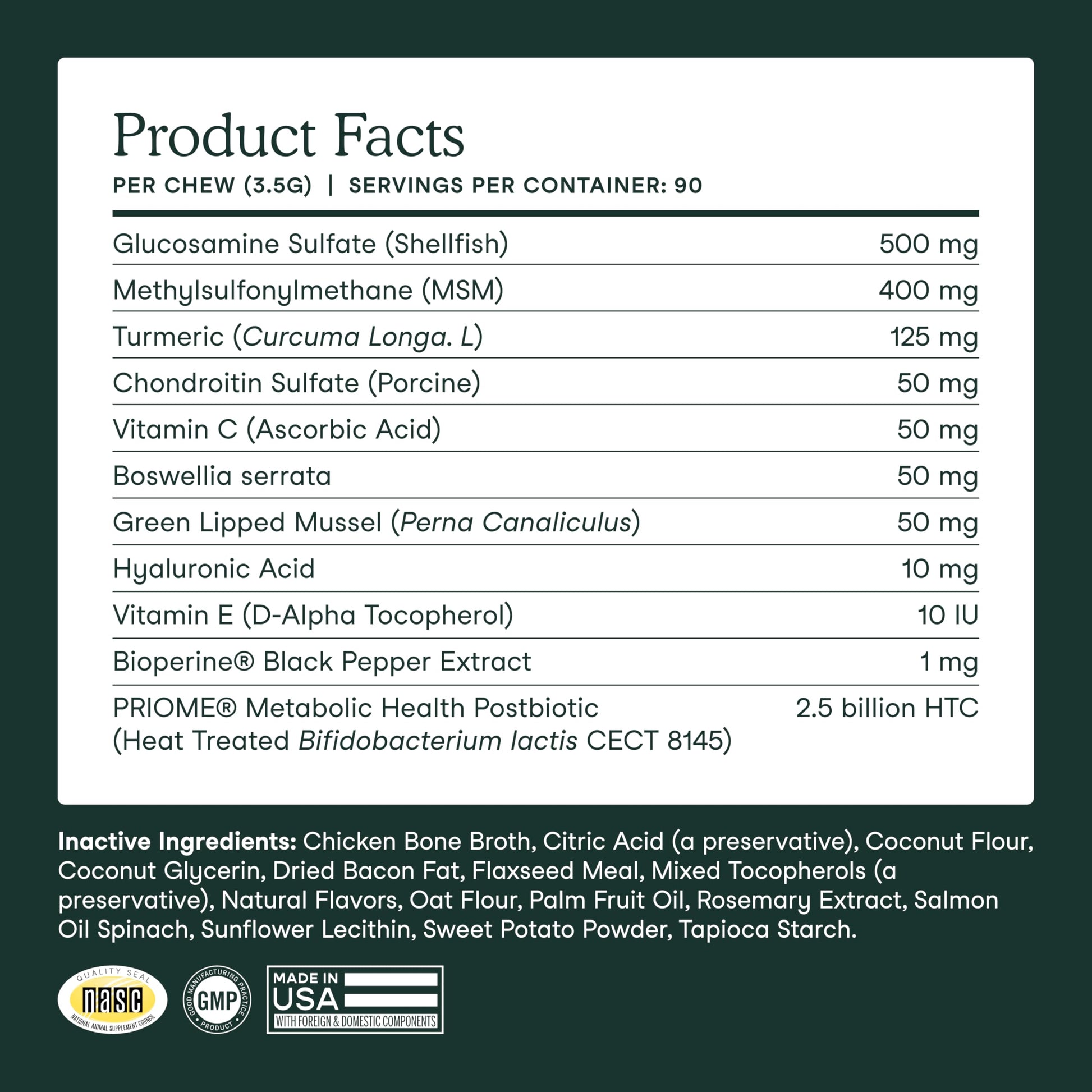 - Premium Traceable Ingredients That Go Beyond the Basics: Includes glucosamine for dogs, chondroitin sulfate, MSM, organic turmeric, green lipped mussel, and boswellia, plus omega 3s and yucca root for powerful, full-spectrum joint care