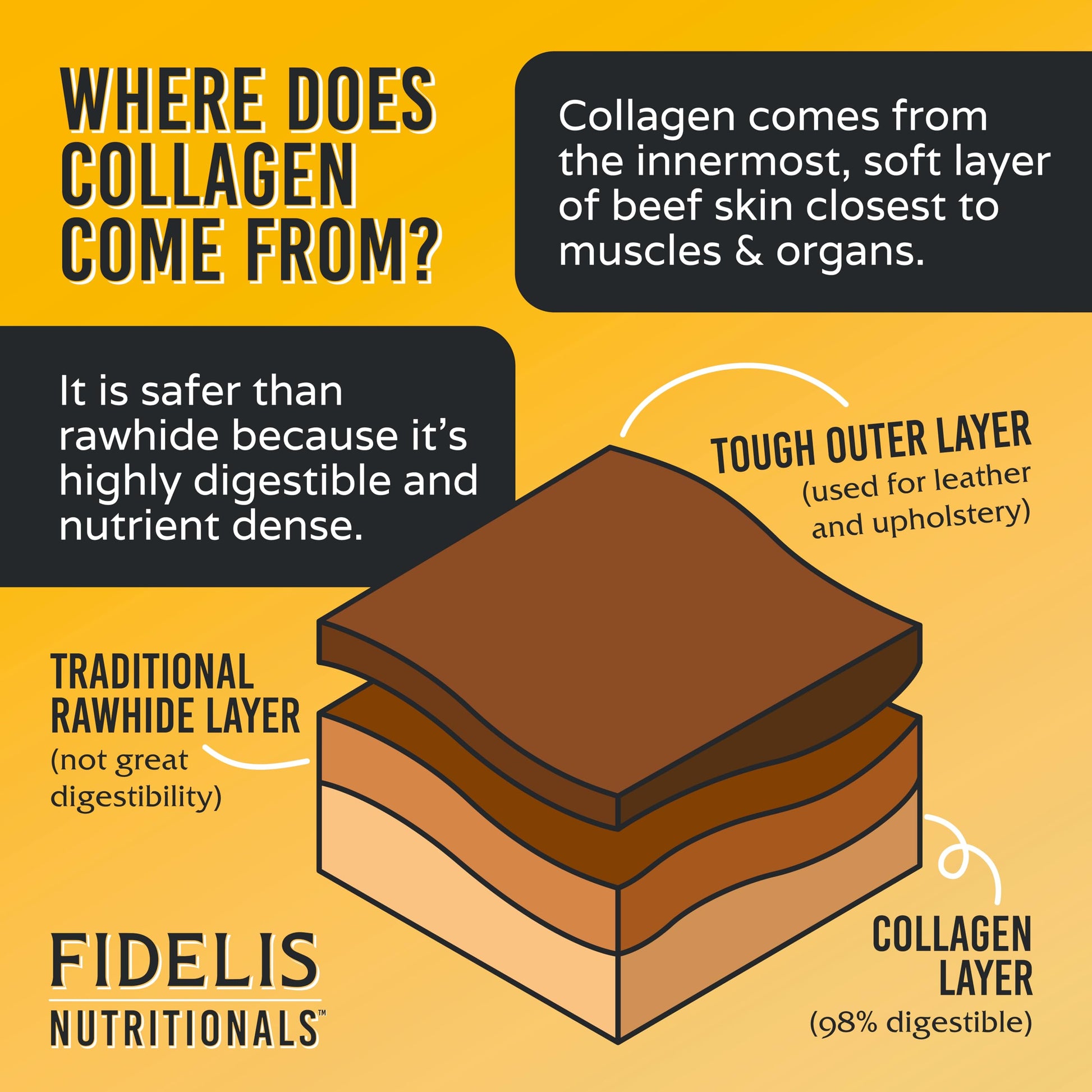 - FREE RANGE BEEF COLLAGEN: FIDELIS Collagen Chews are 100% rawhide free chew sticks are a bone-alternative made with 100% free range beef collagen, making it a much healthier and safer option for small dogs or large dogs. Available in tasty beef, chicken, or peanut butter flavors in both 7inch and 10inch sizes, collagen is a key component of cartilage to cushion and support joints and provides essential amino acids for a glossy coat.