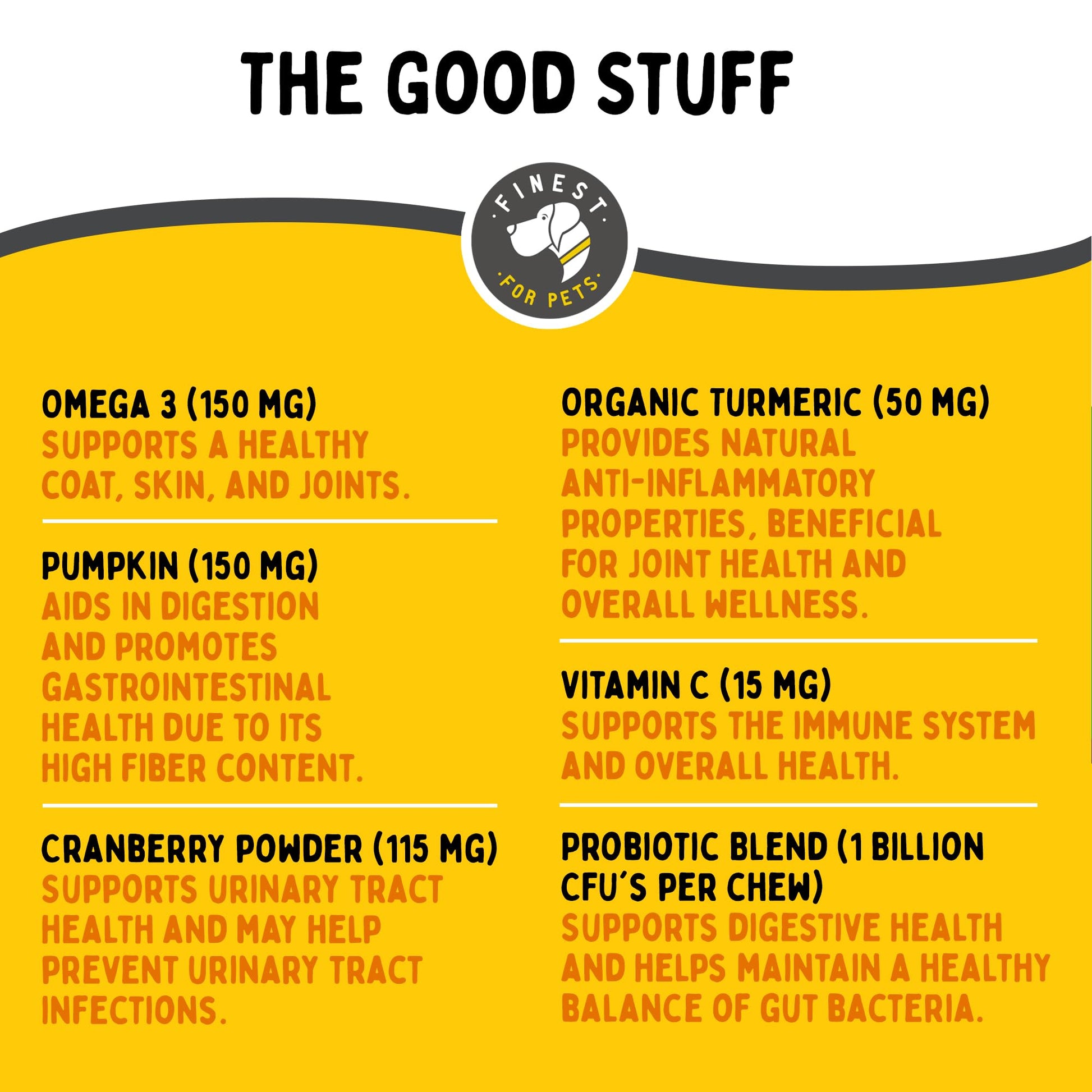 • Made in the USA in a GMP/FDA facility, Allergy Relief for Dogs boasts top-tier quality. Third-party tested, each chew is a mix of Omega-3, probiotics, pumpkin & superfoods like cranberry & turmeric for a health boost