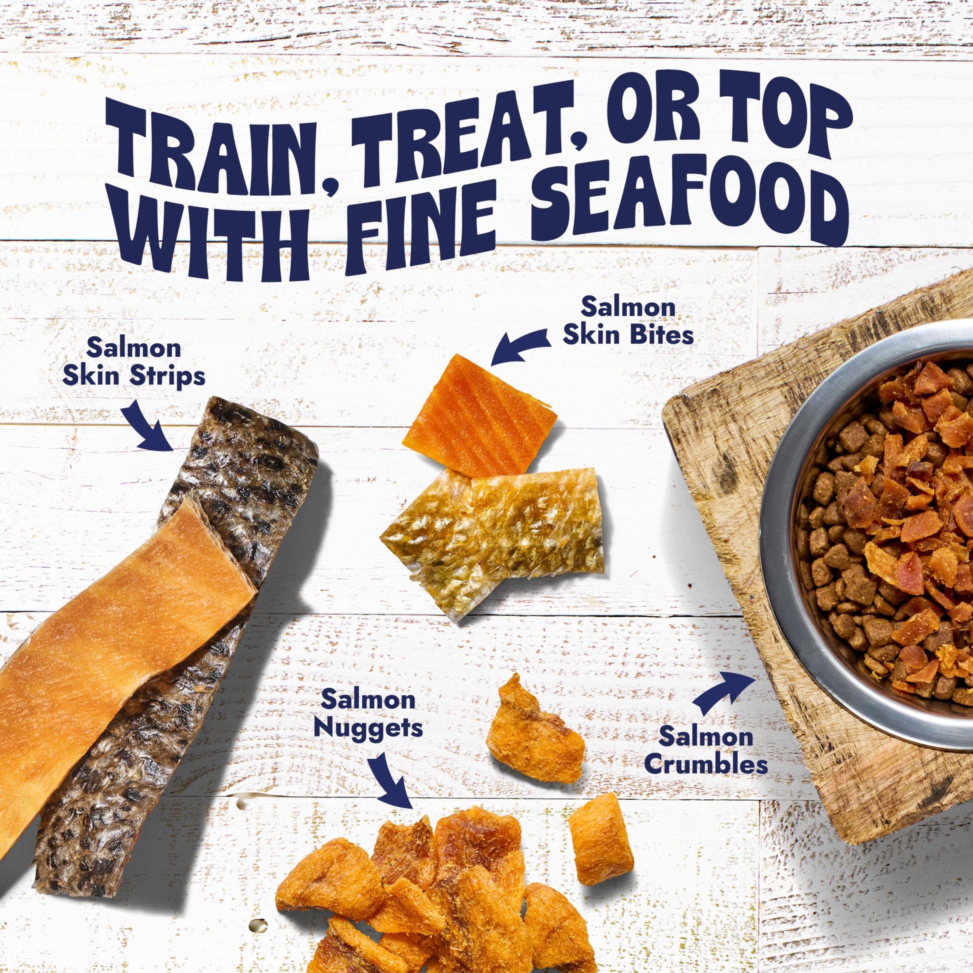 - CRUNCHY SALMON SKIN STRIPS: Naturally crispy texture dogs love. About 5 inches long and 1 inch wide for a high value, satisfying chew.