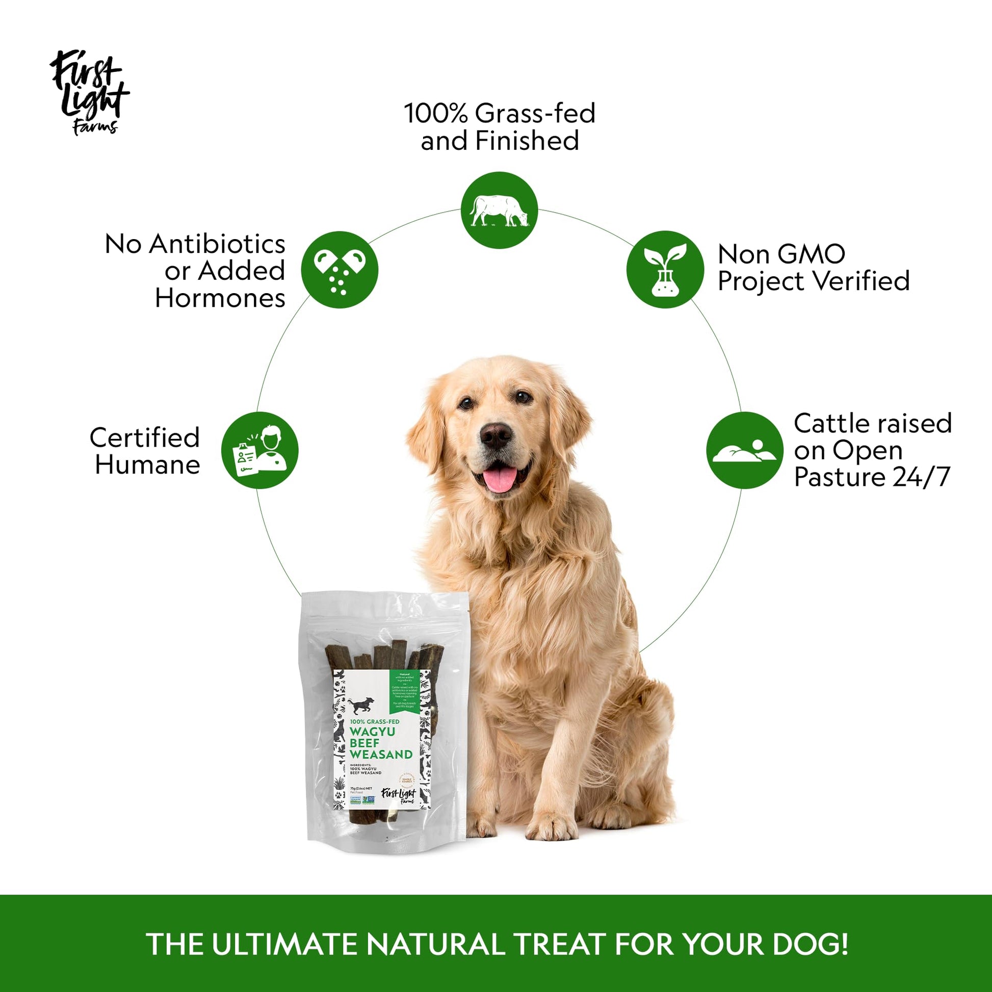 - Great for Teeth & Plaque Control: Healthy dog treats for teeth, the natural texture of First Light Farms Wagyu Beef Weasands provides an enjoyable chew that helps to clean your dog’s teeth. Chewing also promotes gum health by scraping off plaque and tartar, improving dental hygiene with every bite.