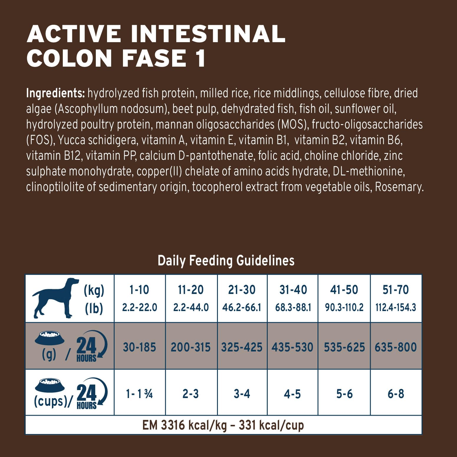 Details: FORZA10 Active Intestinal Colon Fase 1 Dry Dog Food is specially formulated to support intestinal and digestive health in adult dogs. This advanced formula features 21% dietary fiber from brown algae (Ascophyllum Nodosum), helping to restore a healthy gut microbiota and maintain regular intestinal function. Its limited ingredient formula is made with hydrolyzed fish protein, hydrolyzed poultry protein, and carefully selected carbohydrates to minimize the risk of food intolerance. Designed for dogs with sensitive stomachs or intestinal issues, this complete and balanced diet includes added vitamins, minerals, antioxidants, and prebiotics such as FOS and MOS to promote overall well-being. With a 24-hour daily feeding guideline tailored to your dog’s weight, FORZA10 Active Intestinal Colon Fase 1 provides the specialized nutritional support your dog needs for optimal digestive health.