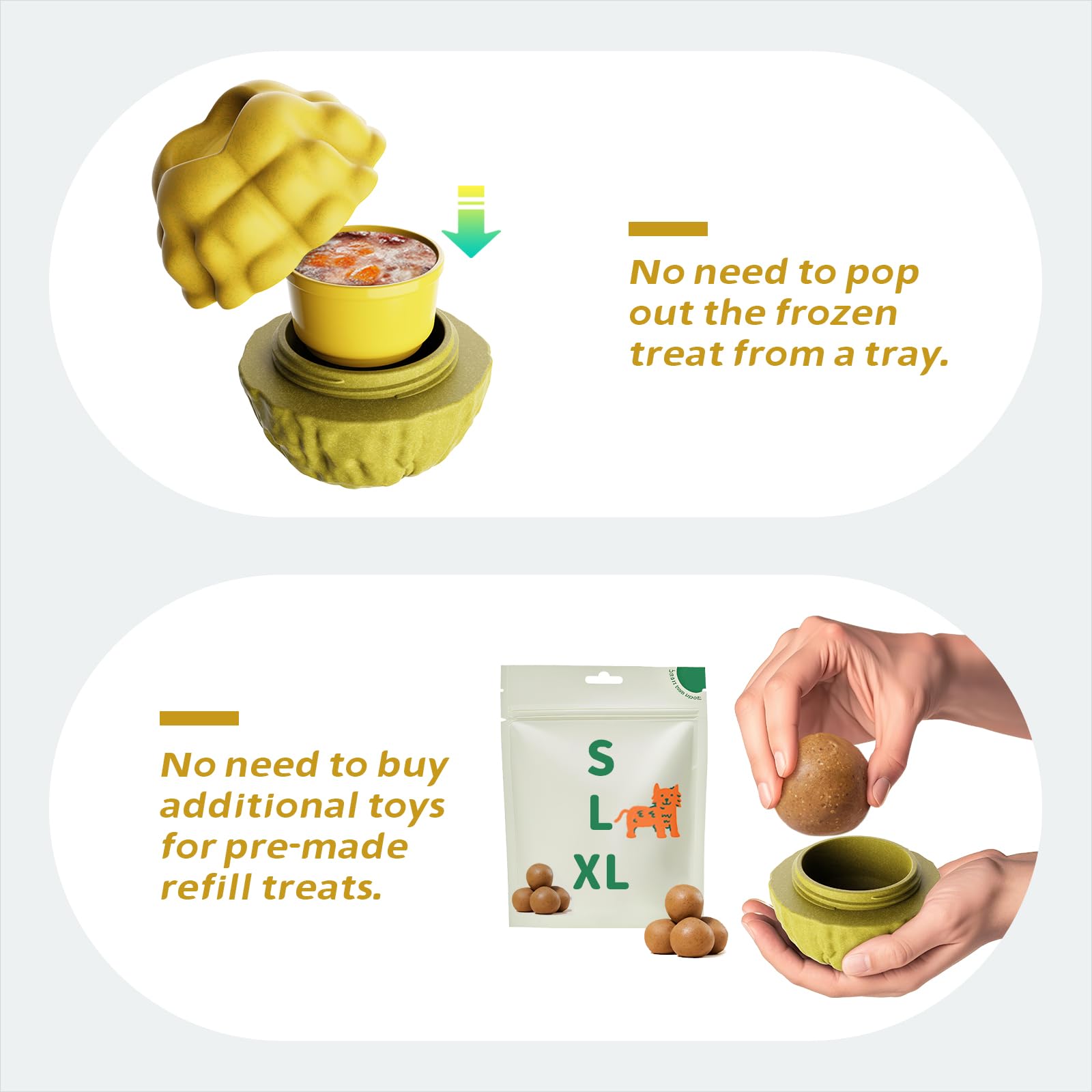 • 【Mess-Free Design and easy to clean】-Frozen Treat Dog Toy with Separate Treat Mold Boxes,just fill the included treat mold boxes with frozen treat,freeze,and pop them directly into the toy,your hand don't need to touch the frozen treat.And the treat mold boxes come with lids, which will prevent odors from spreading in the freezer.The wipeable surface is easy to clean by hand washing or dishwasher.