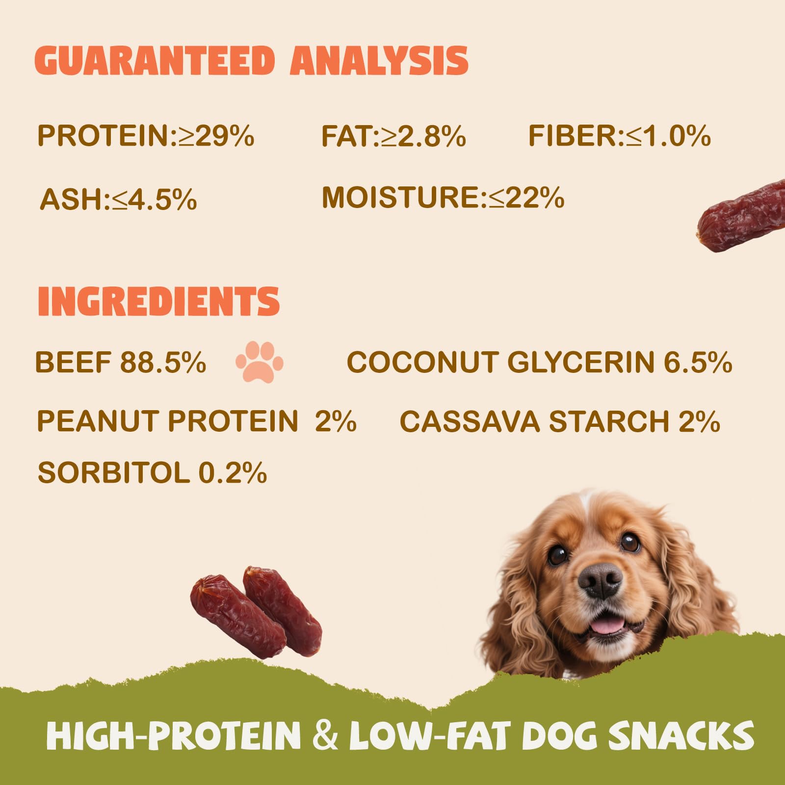 - Premium Beef Sausage Dog Treats: Made with top-quality,high-protein and low-fat beef as the first ingredient,these beef jerky treats are slow-roasted to lock in nutrients and enhance flavor,delivering a healthy and delicious snack for your dog