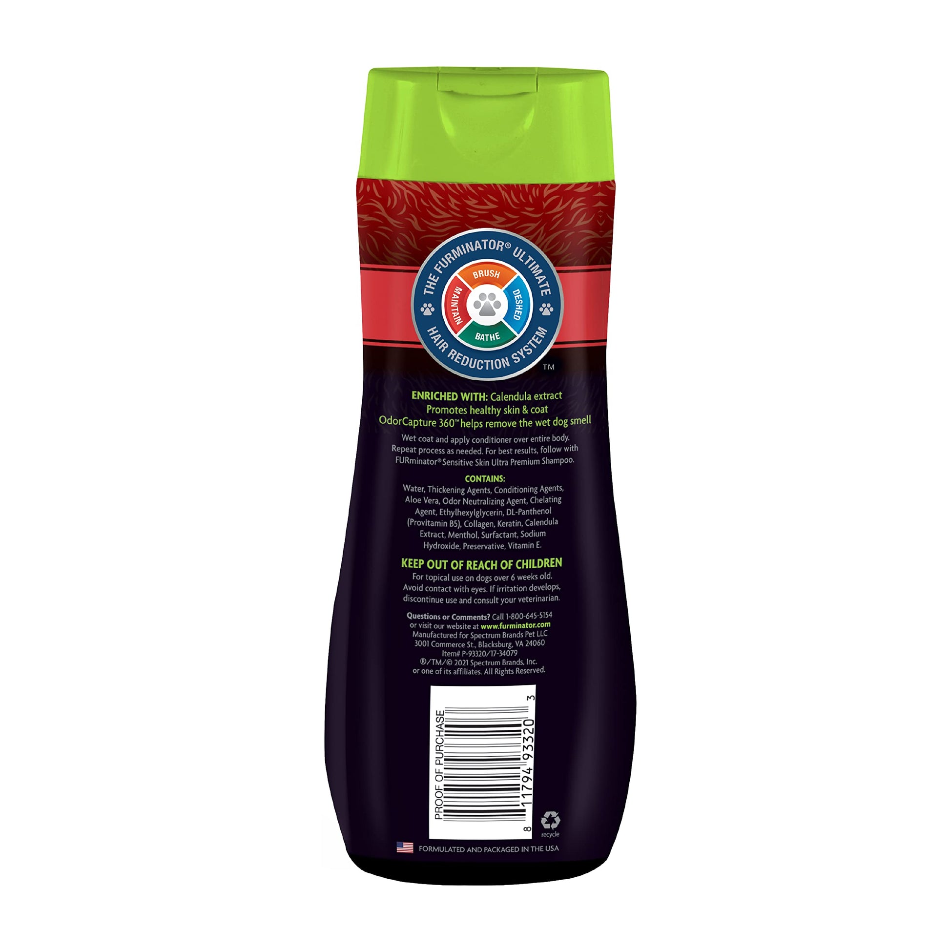 Take your grooming routine into your own hands by implementing the FURminator® Ultimate Hair Reduction System™: Brush, deShed, Bathe and Maintain for grooming confidence in the comfort of your own home. Our deShedding tools, grooming tools and hair solutions offer a grooming regimen catered to any dog or cat. FURminator® Sensitive Skin Ultra Premium Conditioner is enriched with Calendula Extract and menthol for a cooling sensation to your dog’s skin. This sensitive skin formula helps reduce itching due to dry skin and strengthens and nourishes skin and coat. Plus, it’s uniquely formulated without parabens or chemical dyes. Even better, the OdorCapture 360™ Technology helps remove the wet dog smell – which means you’ll want to snuggle up to your fresh and furry friend. The FURminator® Ultimate Hair Reduction System™ has four steps for a complete at-home grooming regimen. Regular shampooing and conditioning promotes healthy skin and coat. To use, wet coat and apply conditioner over entire body. Repeat process as needed. For best results, use with FURminator® Sensitive Skin Ultra Premium Shampoo.