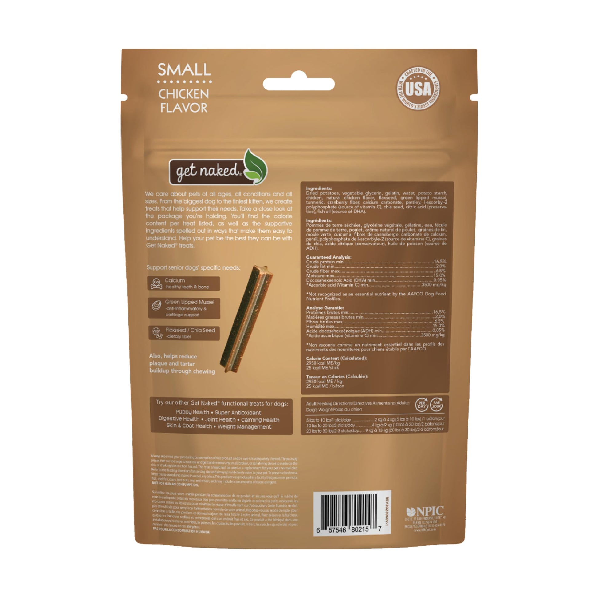 Details: Help support your furry friend's golden age with Get Naked Senior Health Dental Chew Sticks Dog Treats! These tasty treats are specially formulated with calcium to support healthy teeth and bones, also added Green-lipped mussel to provide anti-inflammatory and cartilage support. These senior health sticks help to maintain a healthy life so he can feel his best. These chicken-flavored treats are also grain-free and help to reduce plaque and tartar build-up as your dog chews! Treat your pup to a nutritious snack with these delicious dental chew sticks!
