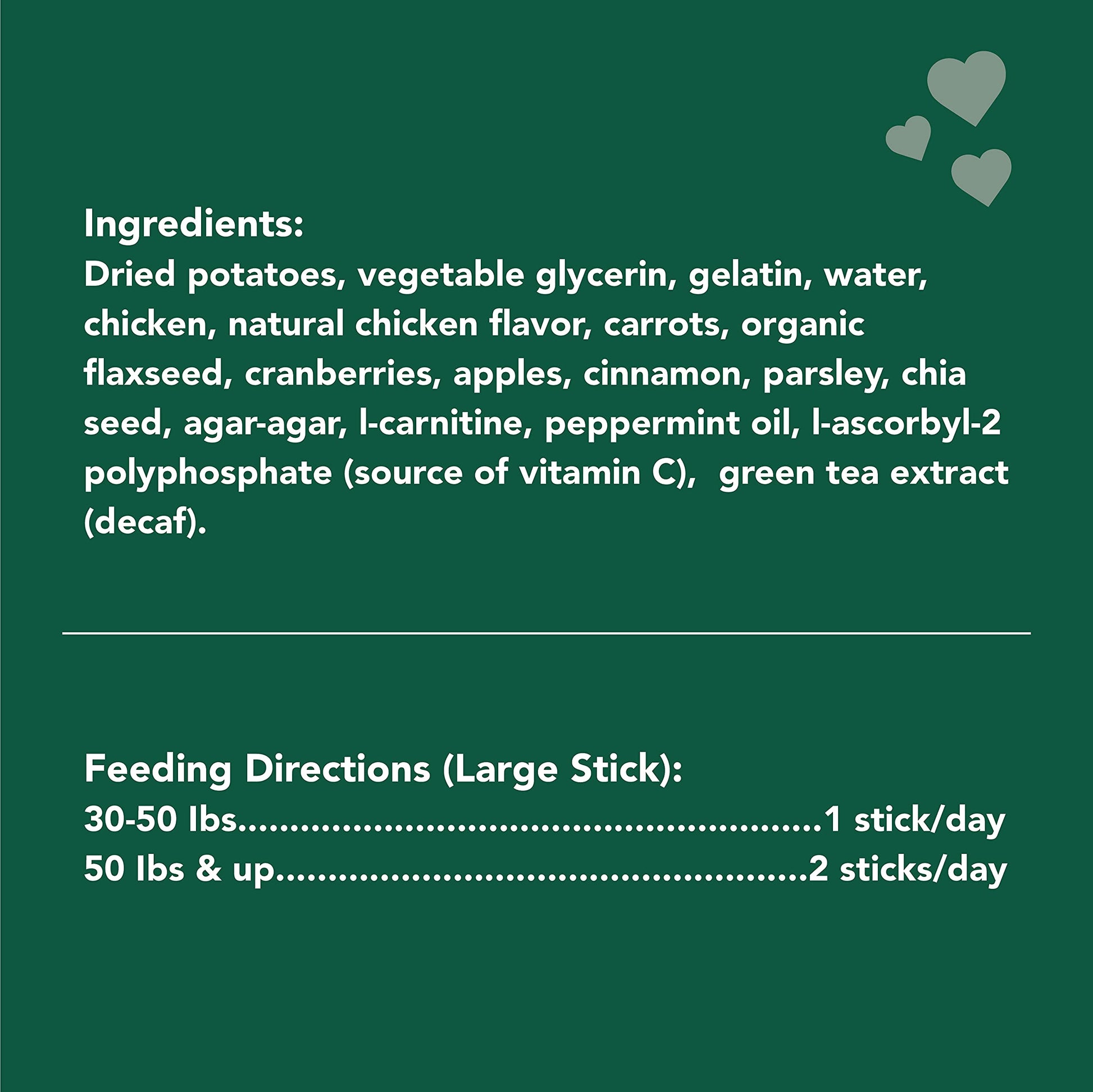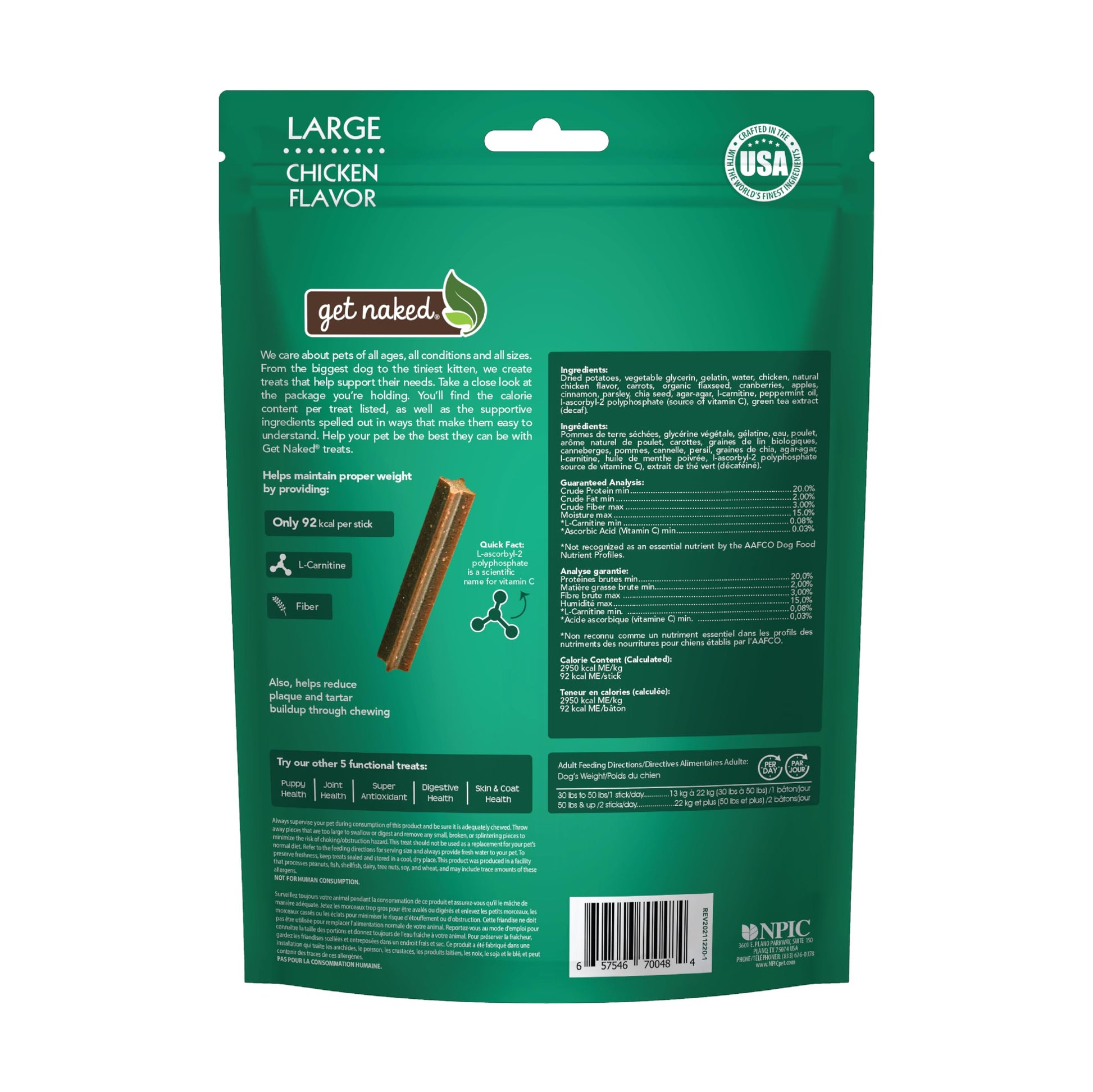 Details: Keeping an eye on the calorie intake of your canine friend? Get Naked Weight Management dental chew sticks are satisfying, guilt-free treats that also encourage good oral hygiene. Plaque and tartar build-up are removed as your dog enjoys the mouth-watering chicken flavor. The treat sticks are grain free and formulated with L-Carnitine to boost and support healthy metabolism.