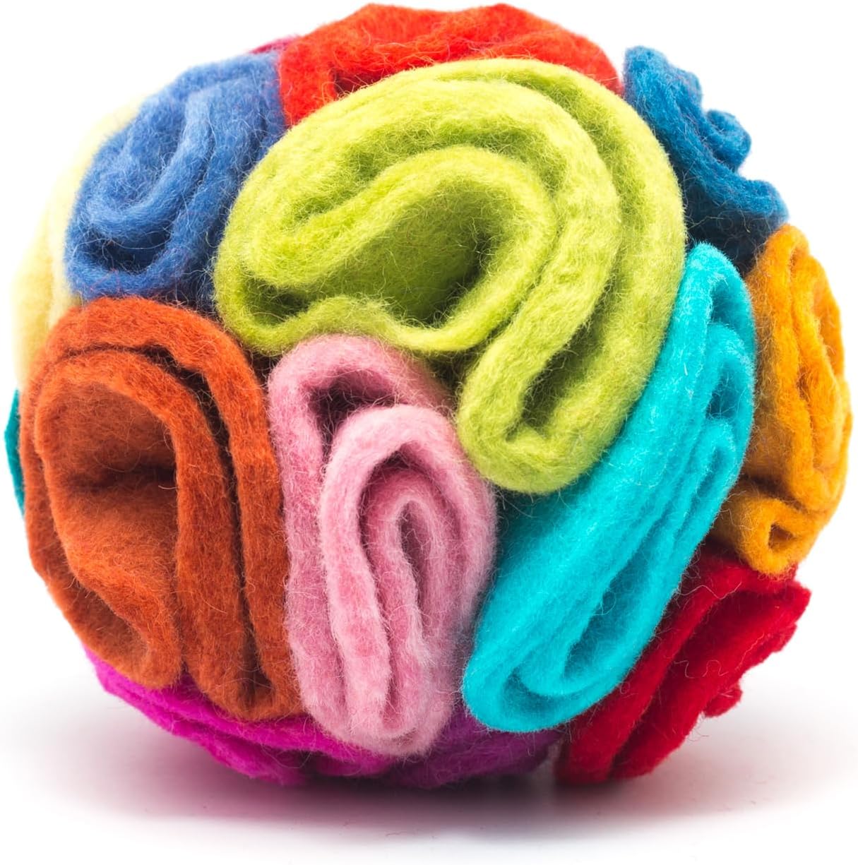 DURABLE & HANDCRAFTED QUALITY: Our dog treat puzzle ball is made in Nepal from 100% natural wool with boiled, densely felted sheets and double-stitched seams for added strength. AZO-free dyes ensure a safe and non-toxic play experience for your furry companion.