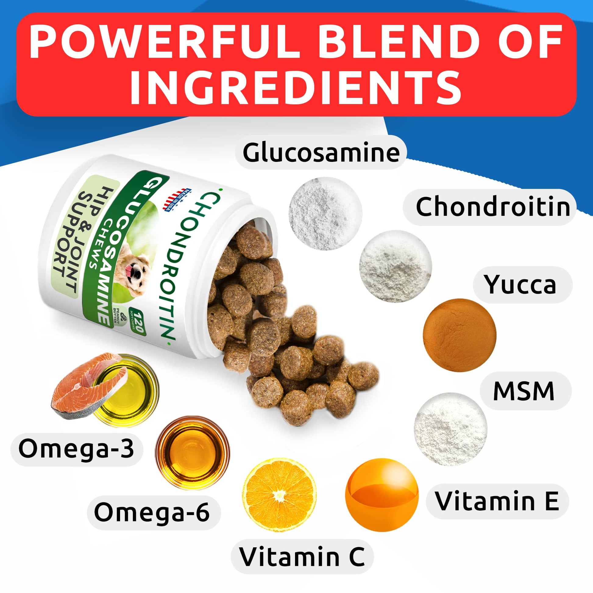 - Vet-Approved Formula: With glucosamine, chondroitin, MSM sulfate & Omega-3-6, our dog hip and joint supplement is the best natural support for your buddy's mobility. Plus, these bites extend the benefits to your pup's flexibility and comfort.