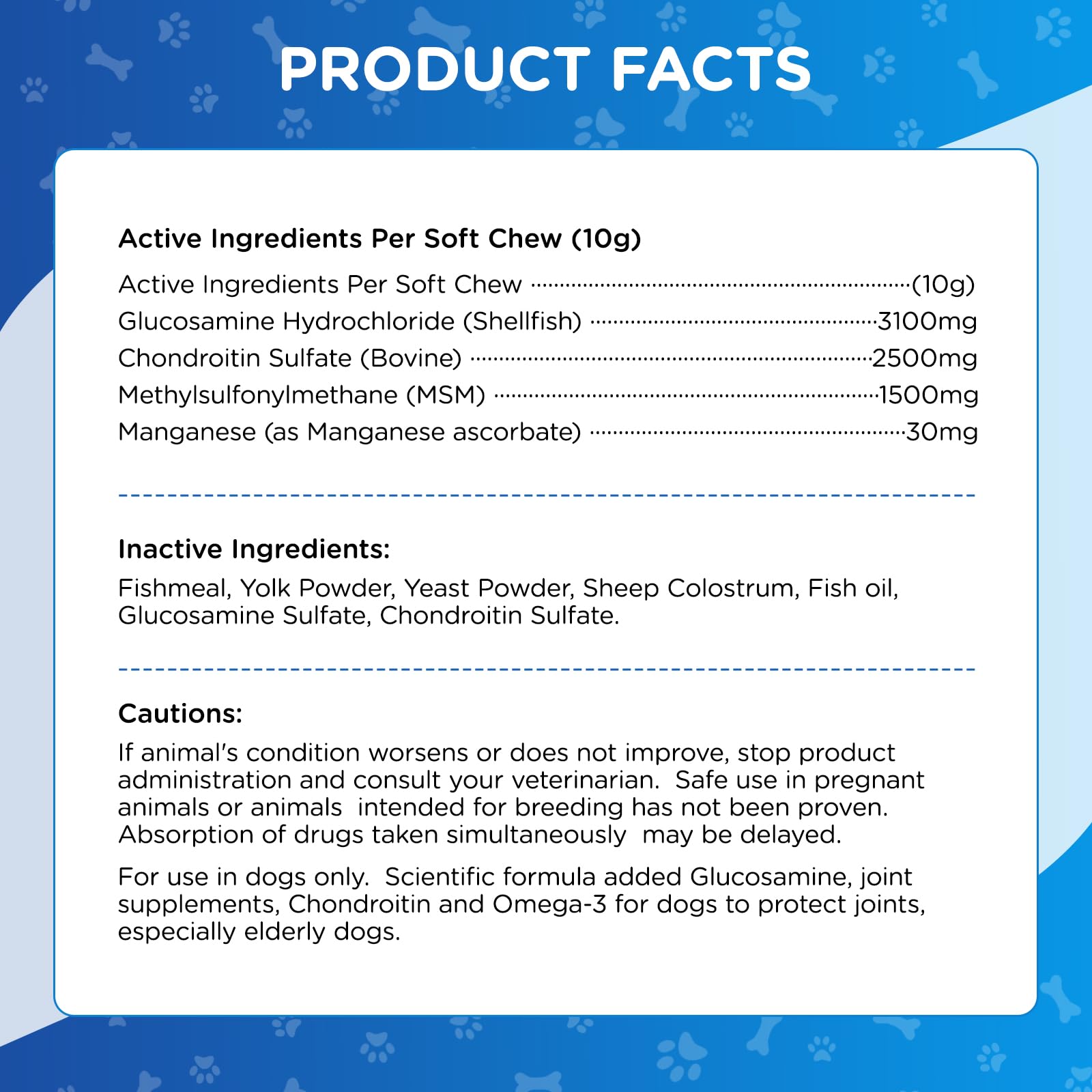 - [Promotes Healthy Cartilage and Joint Function] Joint supplement for dogs is comprehensive support for dog’s joint health. Glucosamine chondroitin for dogs is focused on promoting healthy cartilage and joint function. Each piece of hip and joint chews for dogs is a deep nourishment for the joints, keeping your dog's joints healthy and strong. Hip and joint supplement dogs provides long-lasting care for dogs, and dog hip and joint supplement makes dogs more energetic during their happy runs