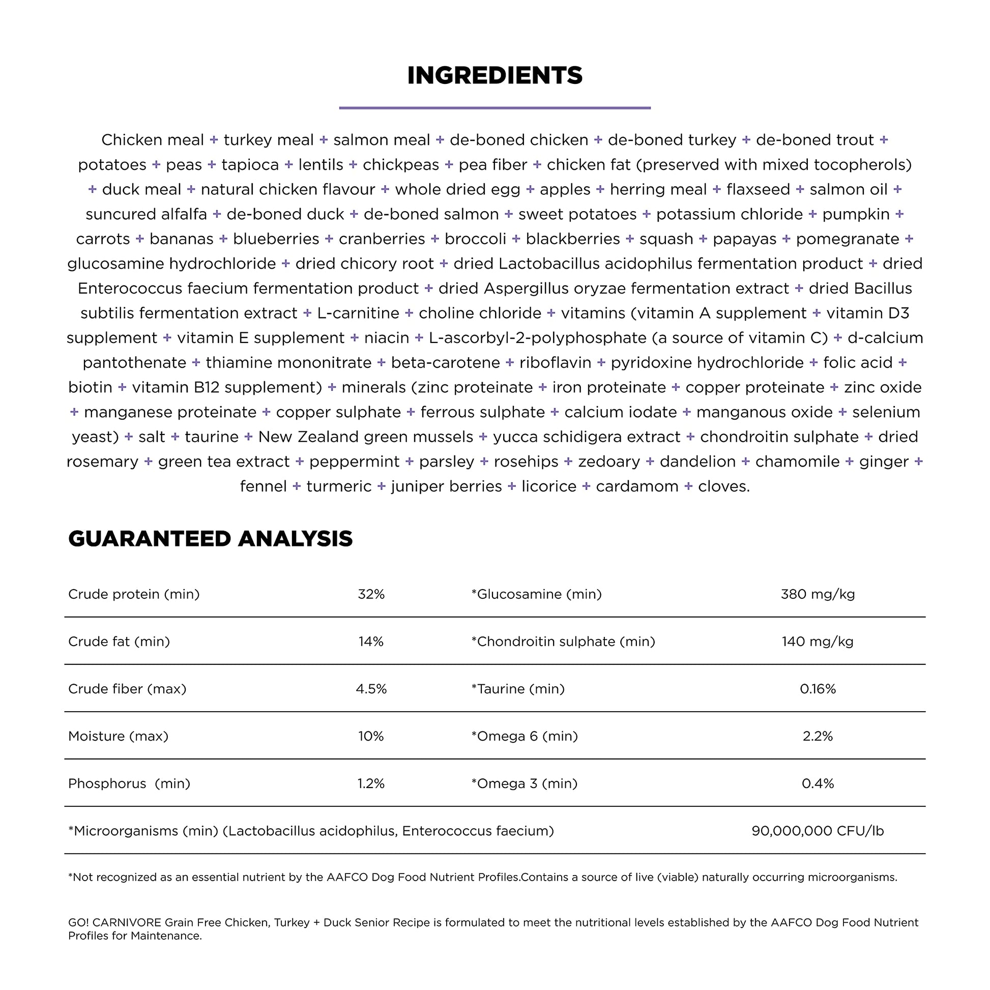 - PROTEIN-RICH FOOD TO SUPPORT STRONG, LEAN MUSCLES: The first six ingredients and 85% of the protein in our grain free CARNIVORE Chicken, Turkey + Duck Senior dog food comes from real premium-quality meat + fish.
