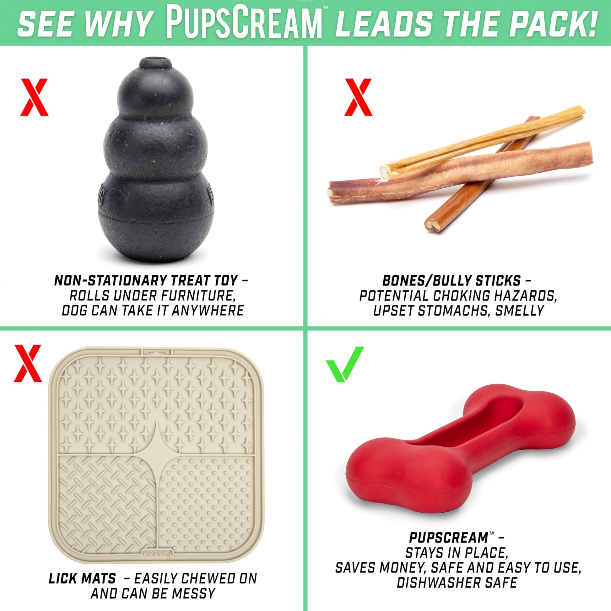 - PETS LOVE IT: Compare to lick mats that can be chewed up, expensive bully sticks that can be choking hazards, and fillable treat toys that end up under the couch; PupsCream is a fun hands-free, mess-free solution for rewarding your dog