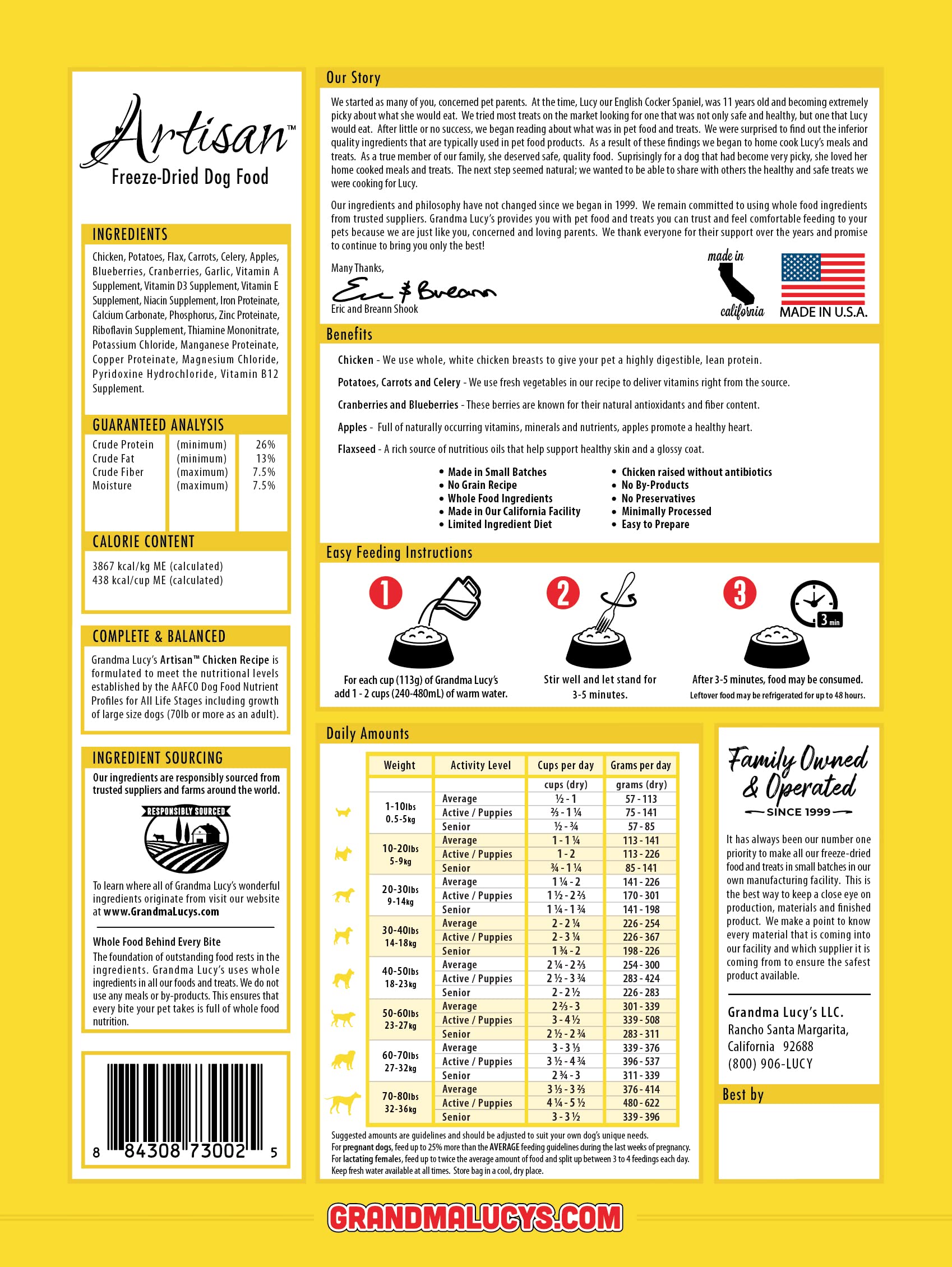 Grandma Lucy's Artisan Dog Food, Grain Free and Freeze-Dried - Artisan Chicken, 1Lb Bag