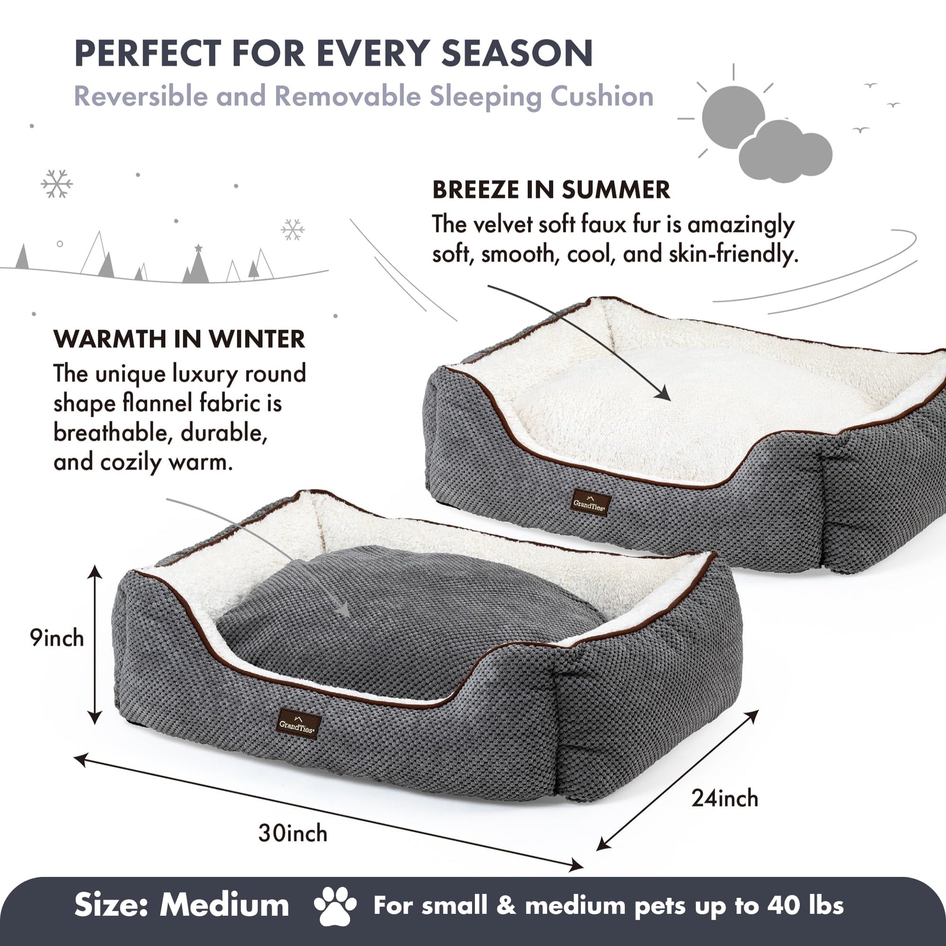 - VERSATILE ALL-SEASON USE - Its reversible and removable sleeping cushion pillow provides cool comfort in summer and warm coziness in winter. The velvet soft faux fur on this dog couch is skin-friendly and provides super comfort. The unique luxury round shape flannel fabric is breathable and warmly cozy. Comfort knows no season.