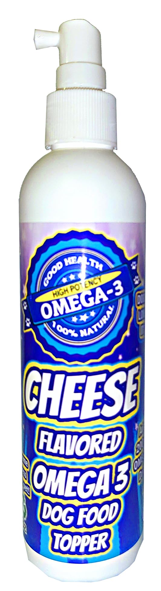 Details: Cheese spray for dry dog food. Will not turn dry dog food mushy or soggy. Easy and convenient to use, no mess, no refrigeration required. Contains Flax seed oil, Chia seed oil, Canola seed oil, Olive seed oil and Soybean oil along with natural flavorings. Flavored Omega 3 dog food toppers are delicious and holistic blends of all natural, human grade, edible oils and natural flavorings that dogs love. Made with human grade edible oils, no artificial ingredients or preservatives. Made in the USA. Flavored sprays can be applied to dry or wet dog food to enhance the aroma and flavor. Flavored sprays add Omega 3 to every meal which has been demonstrated to support healthy skin and coat. Great for picky eaters. Will not turn dry dog food mushy or soggy. No refrigeration necessary. Delicious and nutritious, makes every meal a dog treat. Made with Virgin olive oil, canola seed oil, soybean oil, flax seed oil and chia seed oil along with human grade flavorings. Does not contain any protein or salt. One 8 oz bottle will last 3 months with 2 meals per day and 3-4 sprays per meal. Great for picky eaters.