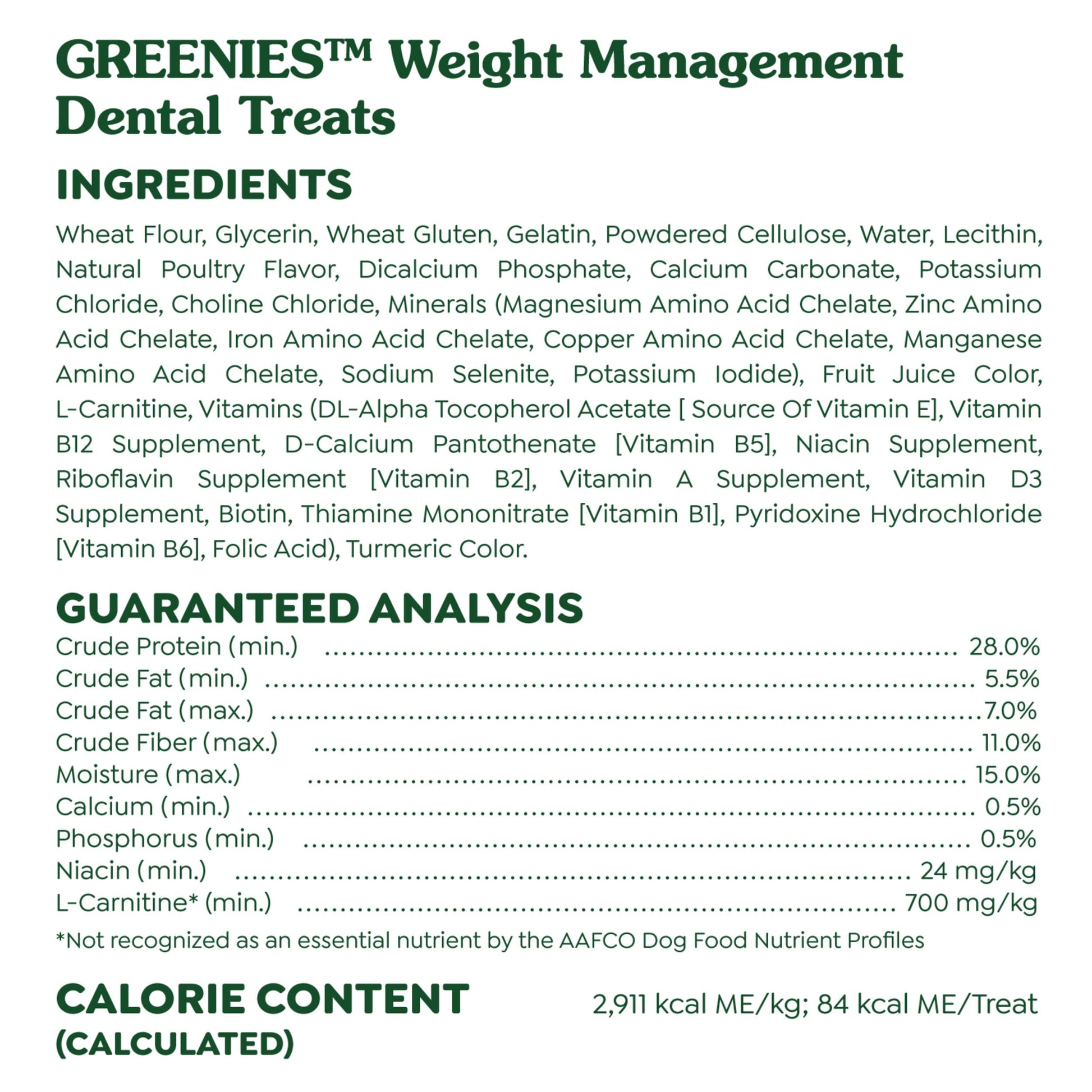 Details: One Greenies Weight Management Dental Treat is all it takes for clean teeth, fresh breath, and a happy dog. Your small dog can't wait to sink their teeth into these delicious dental dog treats because they feature a unique texture that's not only enjoyable to chew, but also fights plaque and tartar. Best of all, these natural treats for overweight dogs contain fewer calories and feature metabolism-boosting L-carnitine to help overweight or less active dogs achieve and maintain a healthy weight. Irresistibly tasty and incredibly powerful, Greenies Treats for Dogs are also vet-recommended for at-home oral health care and accepted by the VOHC (Veterinary Oral Health Council.) Give your dog the mouth-wowing treat that helps promote their overall health with Greenies Dog Treats. Great for small breeds and dogs between 15 and 25 lbs. Natural Dog Treats Plus Vitamins, Minerals, and Other Nutrients.
