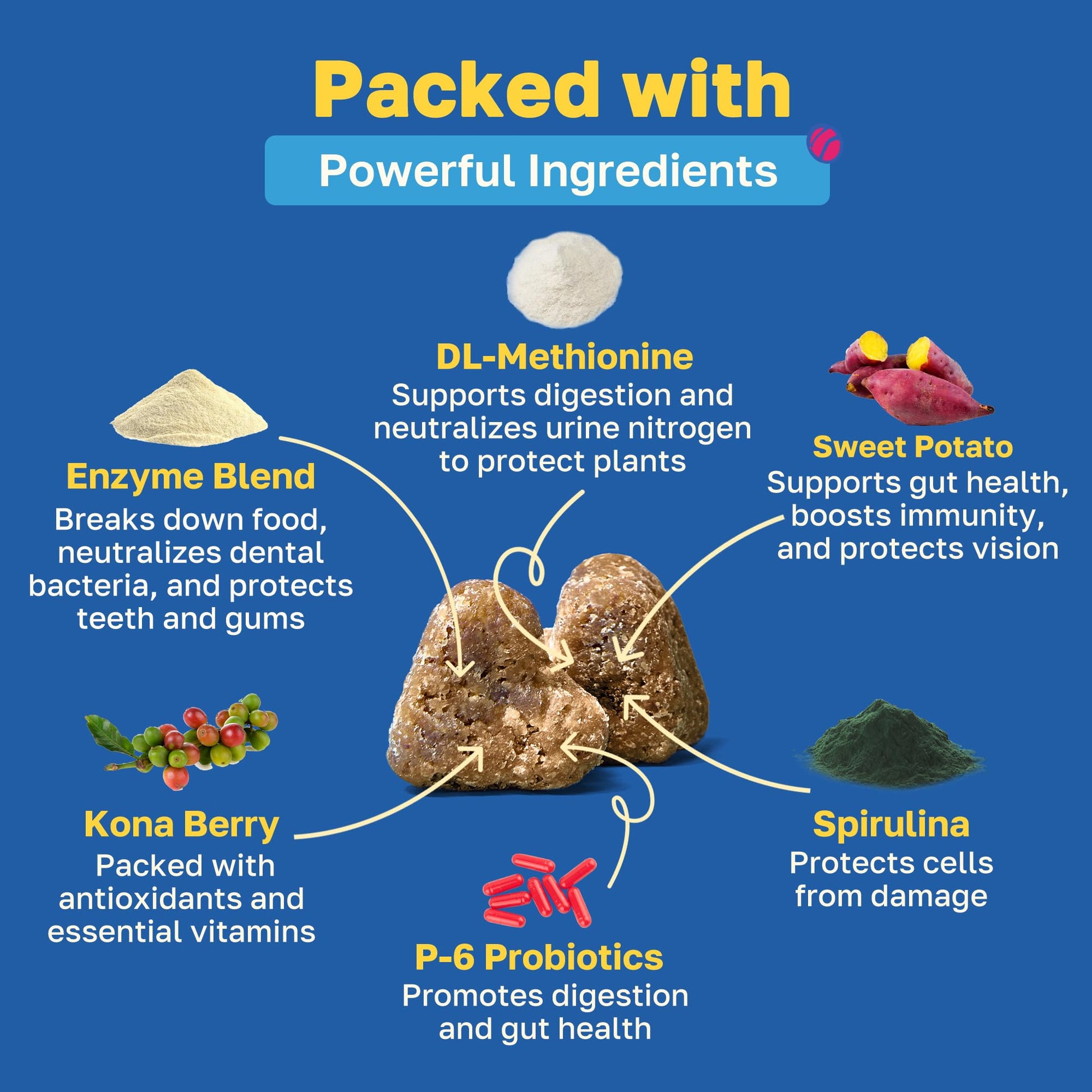 - POWERFUL INGREDIENTS FOR DAILY WELLNESS: Happy Paws Lawn Saver Chews feature an antioxidant rich blend, including Kona Berry, Sweet Potato, and Spirulina. These plant based ingredients work together to provide essential nutrients for your dog while supporting a balanced lifestyle. Made with care for dogs of all breeds and sizes.