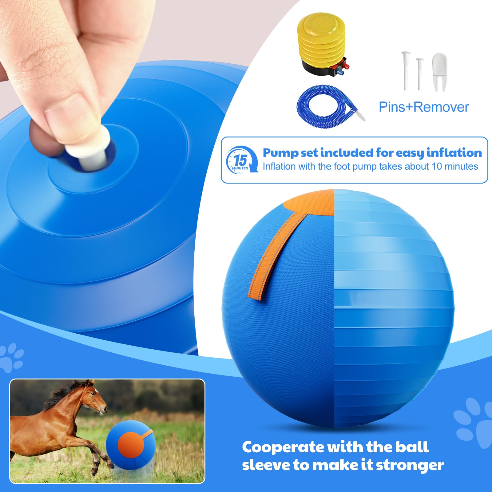 【Multi-Purpose & Versatile Use】Beyond dogs, horse ball work for horses, goats, or livestock. Includes quick-inflation kits (inflation manual foot pump, long air connection hose, air pump nozzles, dog ball plug, ball plug remover) and handles for easy play, making them perfect for farms, parks, or training sessions