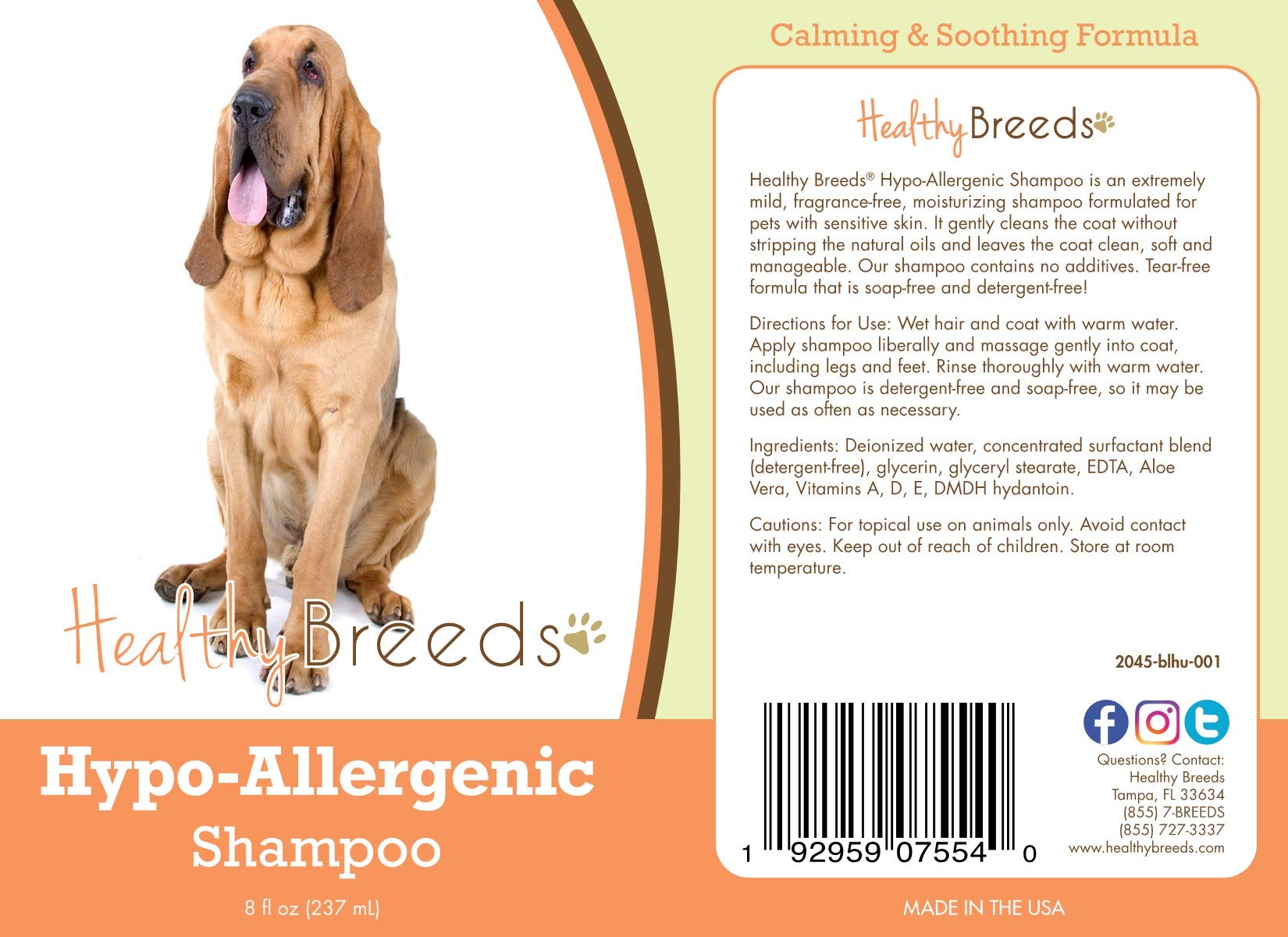 Details: Healthy Breeds hypo-allergenic shampoo is an extremely mild, fragrance-free, moisturizing shampoo formulated for pets with sensitive skin. It gently cleans the coat without stripping the natural oils and leaves the coat clean, soft and manageable. Our shampoo contains no additives. Tear-free formula that is soap-free and detergent-free!