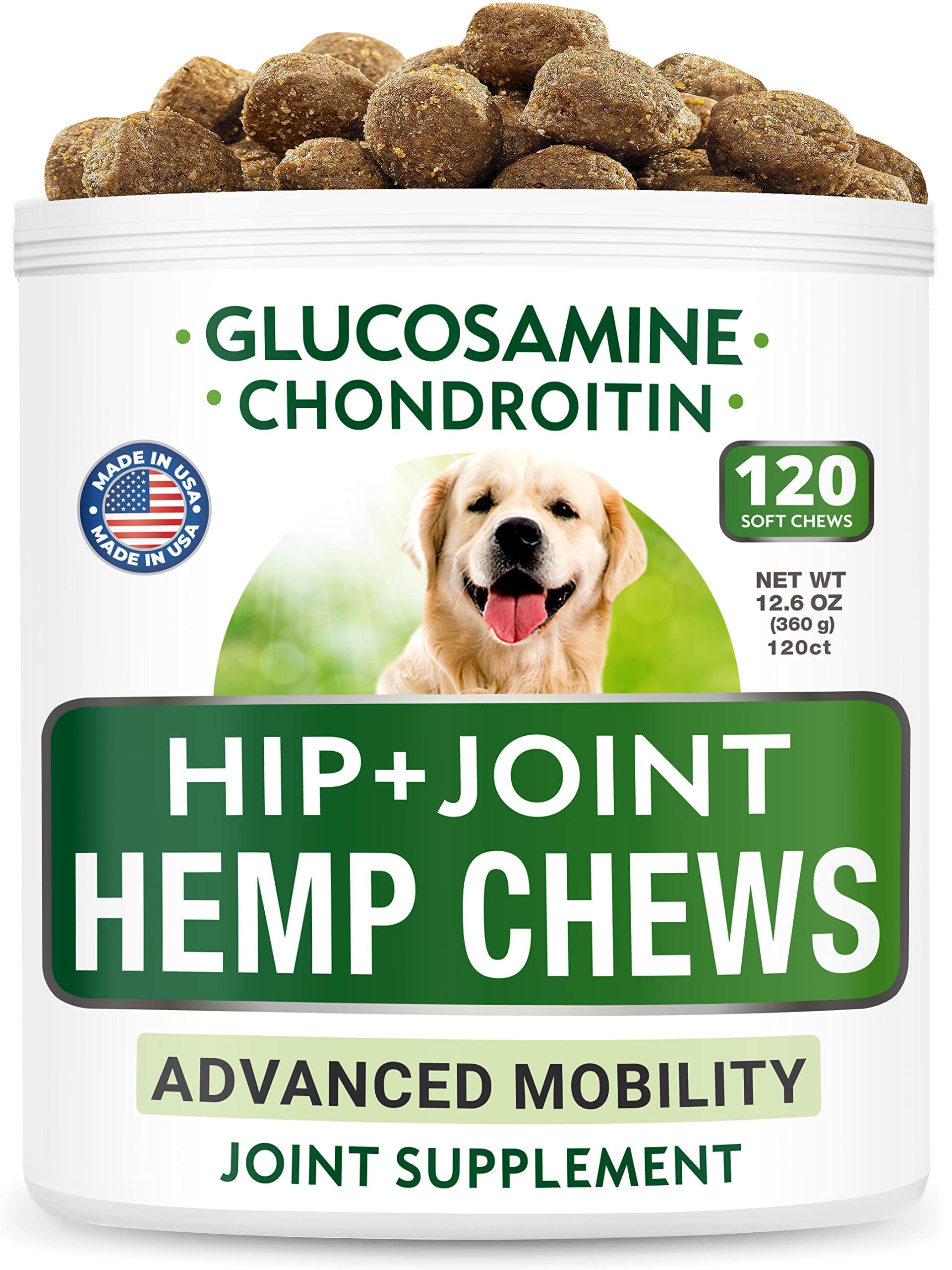 - Now with Hemp + Glucosamine + Chondroitin - all vital elements and extracts to improve canine strength, energy and mobility, support strong bones, general health and wellness. Chewables can be served with regular pet food to both puppy and senior dogs.
