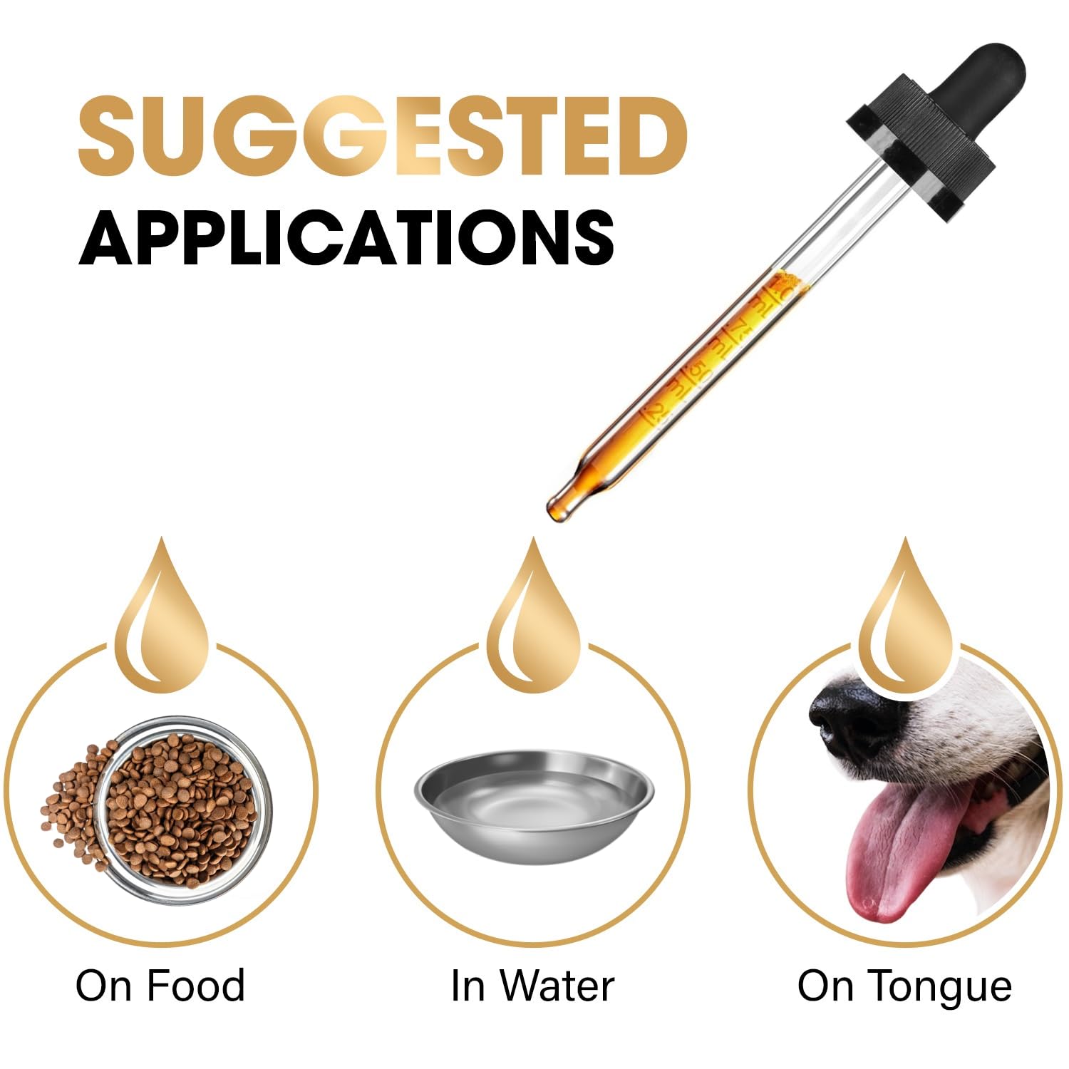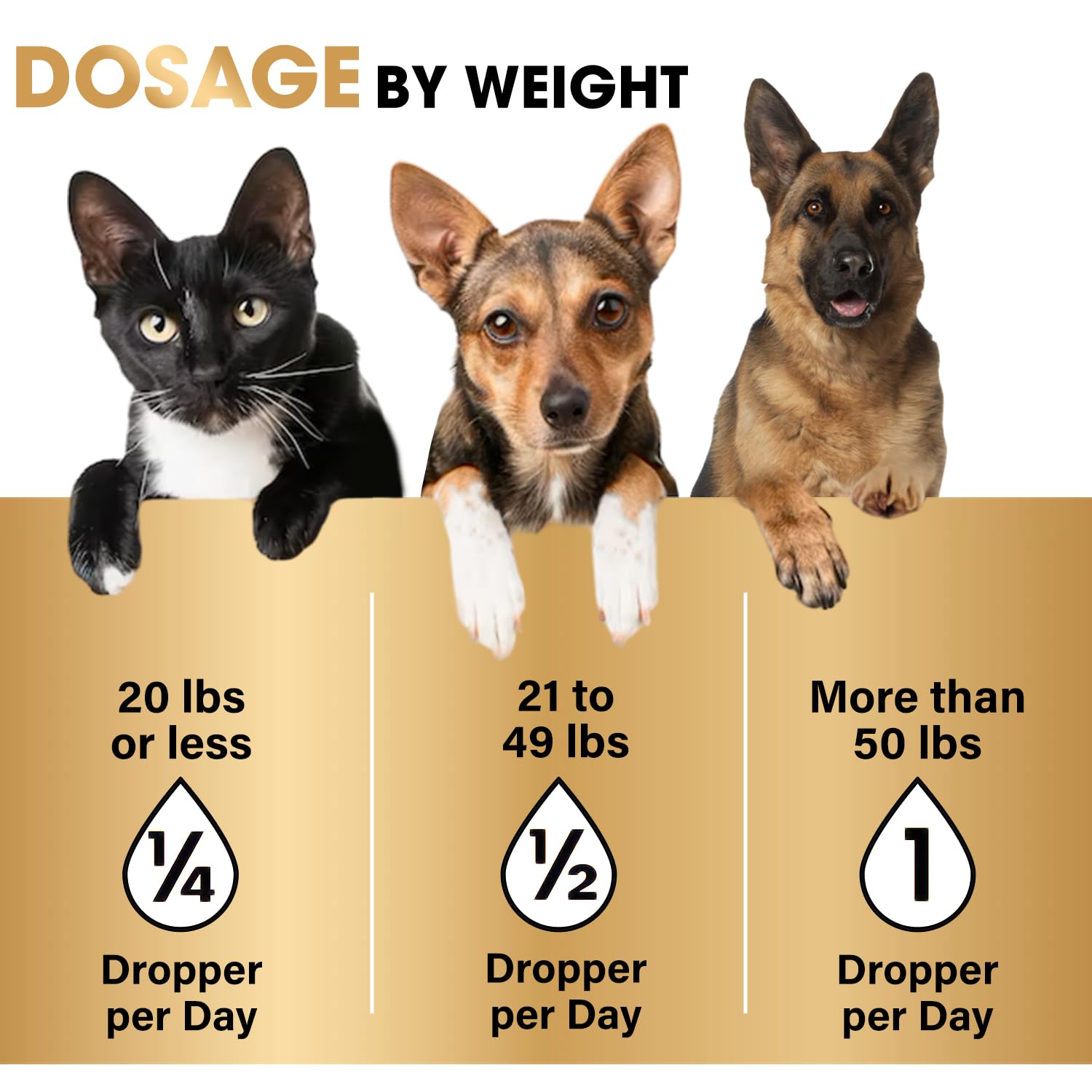DOSAGE INSTRUCTIONS: Use in pet’s food, water, on a treat, or put directly in pet's mouth 20 lbs or less - 1/4 dropper (per day) 21 - 49 lbs - 1/2 dropper (per day) 50 lbs or more - 1 full dropper (per day)
