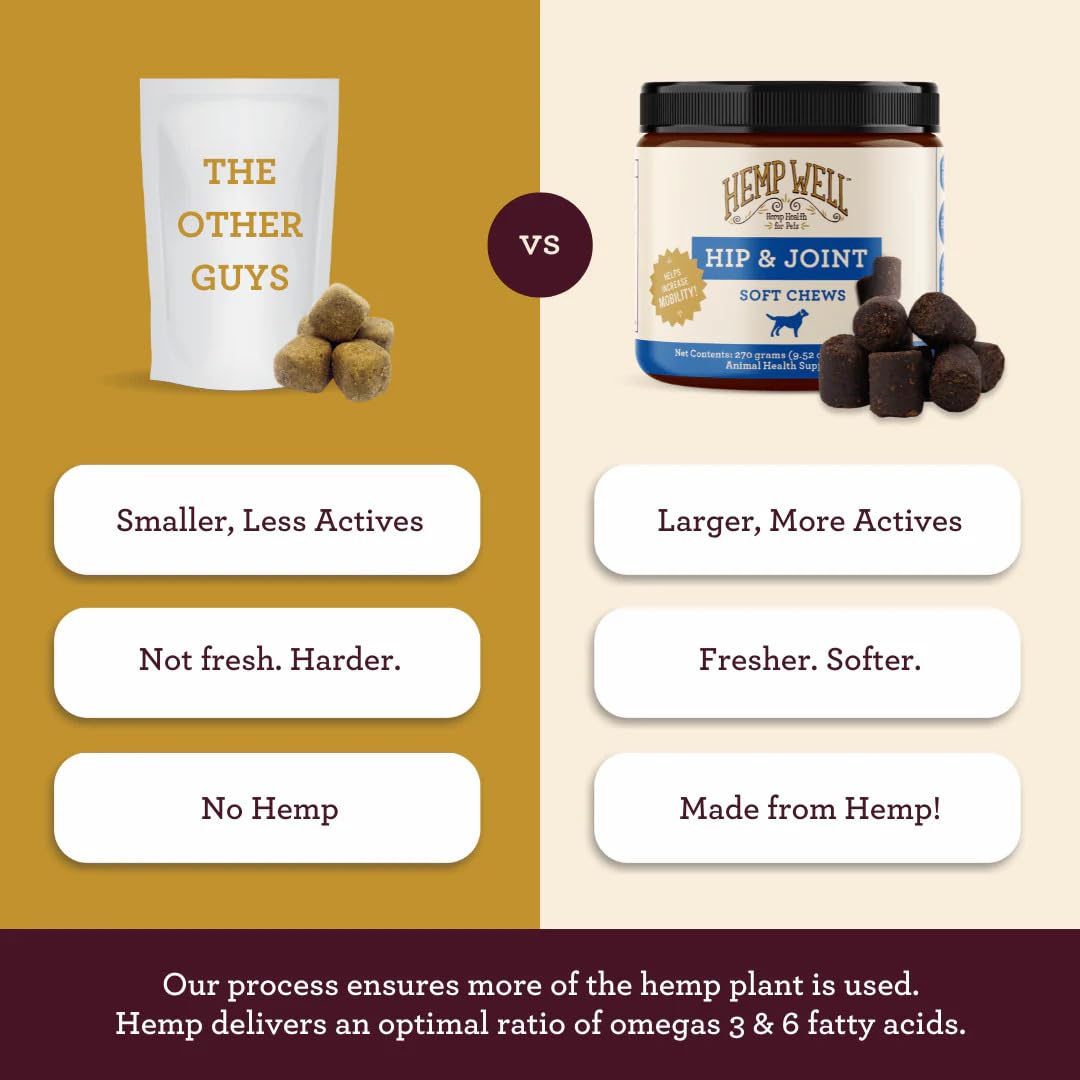 - These dog joint supplements contain hemp for dogs, making them the top choice for senior dog joint care and mobility supplements. Share with your furry friend Hemp Well hip and joint chews for dogs