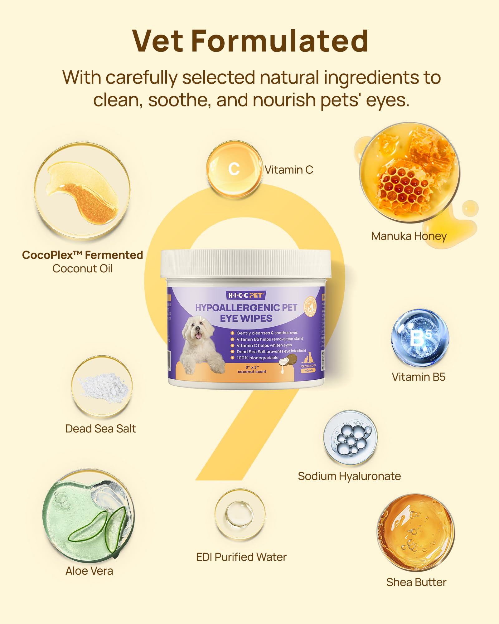 HICC PET Eyes Wipes for Dogs & Cats - Gently Remove Tear Stain, Debris, Discharge, Crust - Coconut Oil Pet Cleaning Grooming Deodorizing Wipes Wash Cleaner for Eyes, Wrinkle, Face - 100pcs