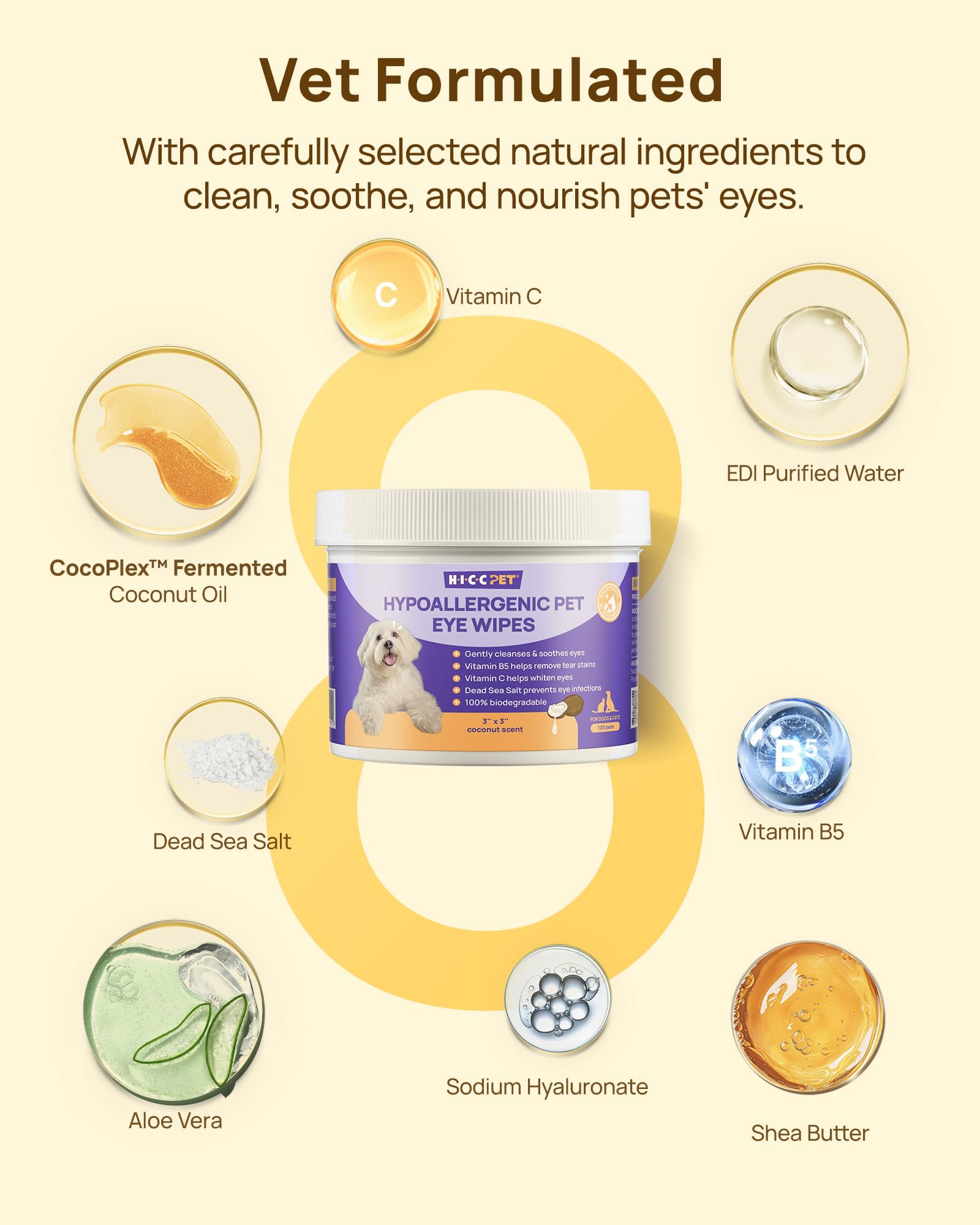 HICC PET Eyes Wipes for Dogs & Cats, Vet-Recommended Dog Eye Infection Treatment, Gently Remove Tear Stain, Debris, Discharge - Hypoallergenic Pet Eye Wash Cleaner for Eyes, Wrinkle, Face - 100pcs