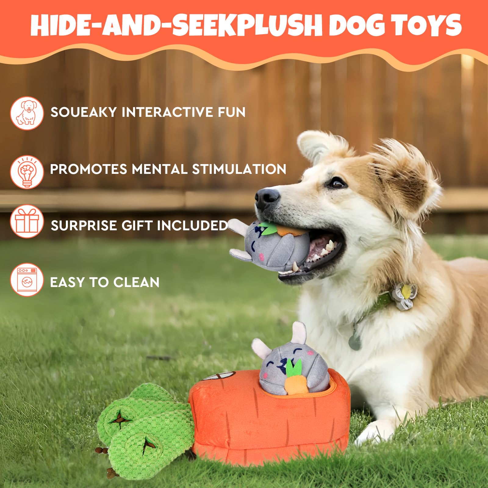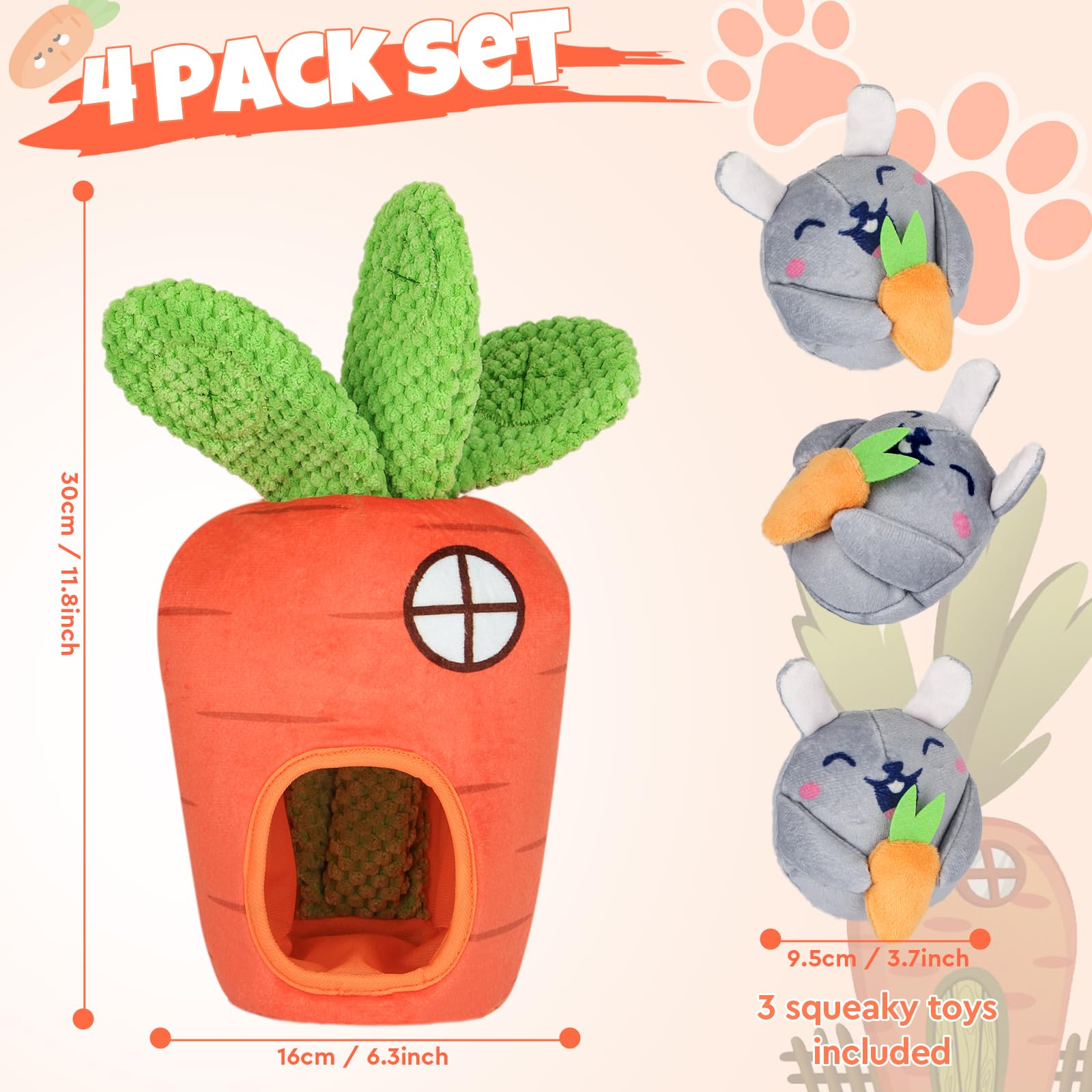 Hide and Seek Squeaky Dog Plush Toy Carrot and Bunny Set, 4 Pack Dog Puzzle Toys for Training and Cleaning, Interactive Tough Dog Toy for Small Medium Dogs