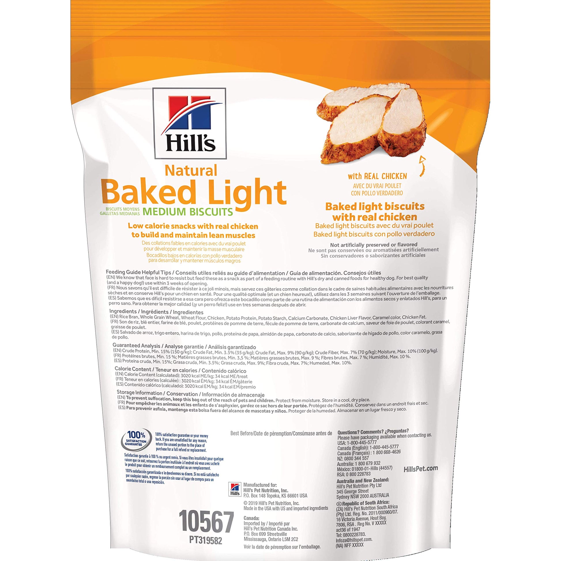 Details: Hill’s Natural Baked Light Biscuits. Made in the USA with global ingredients you can trust, these low-calorie dog treats make a satisfying snack your pet will love. They’re made with real chicken, and aren’t artificially preserved or flavored. Use them as a healthy training treat, or a delicious addition to your dog’s regular feeding routine.